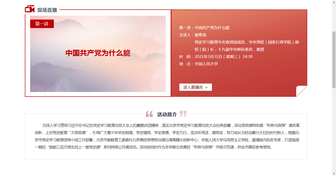 为深入学习贯彻习近平总书记在党史学习教育动员大会上的重要讲话精神,引导广大师生做到学史明理、学史增信、学史崇德、学史力行,增强“四个意识”、坚定“四个自信”、做到“两个维护”,不断提高政治判断力、政治领悟力、政治执行力。3月31日下午,由北京市委教育工委、北京高校思想政治理论课高精尖创新中心打造的“首都百万师生同上一堂党史课”网络公开课启动仪式暨首场报告会在中国人民大学举行。中央党校(国家行政学院)副校(院)长谢春涛教授应邀担任首讲嘉宾,聚焦“中国共产党为什么能建立新中国”“为什么能收拾好国民党的烂摊子”等重点问题,系统总结了中国共产党“有远大理想追求”“有科学理论引领”“有选贤任能机制”“有严明纪律规矩”“有自我革命精神”“有强大领导能力”等六个方面优秀特质,科学解答了“中国共产党为什么能”这一重大课题。按照学校党委教师工作部要求,学院组织各系全体无课的教师通过网络直播方式参与线上聆听学习,积极报送学习感想,反响热烈。