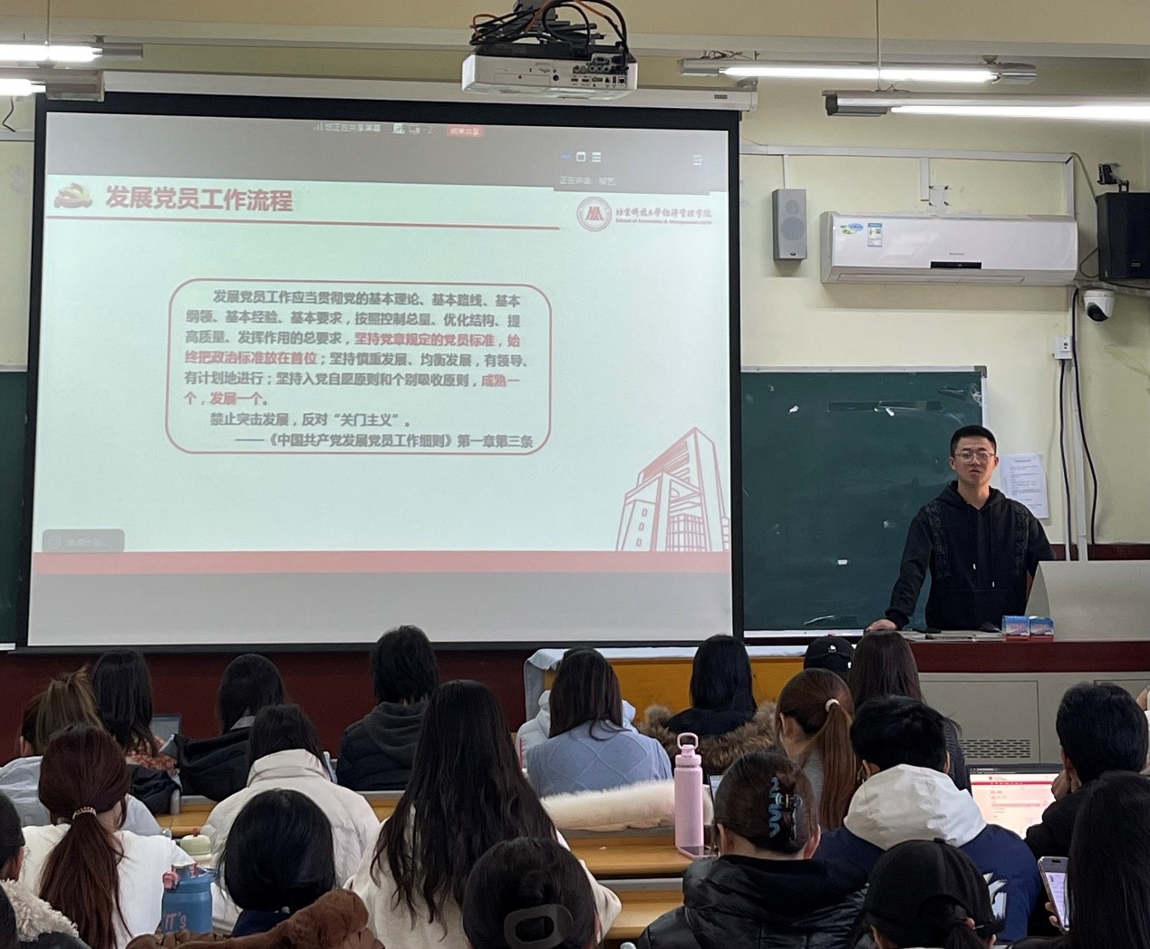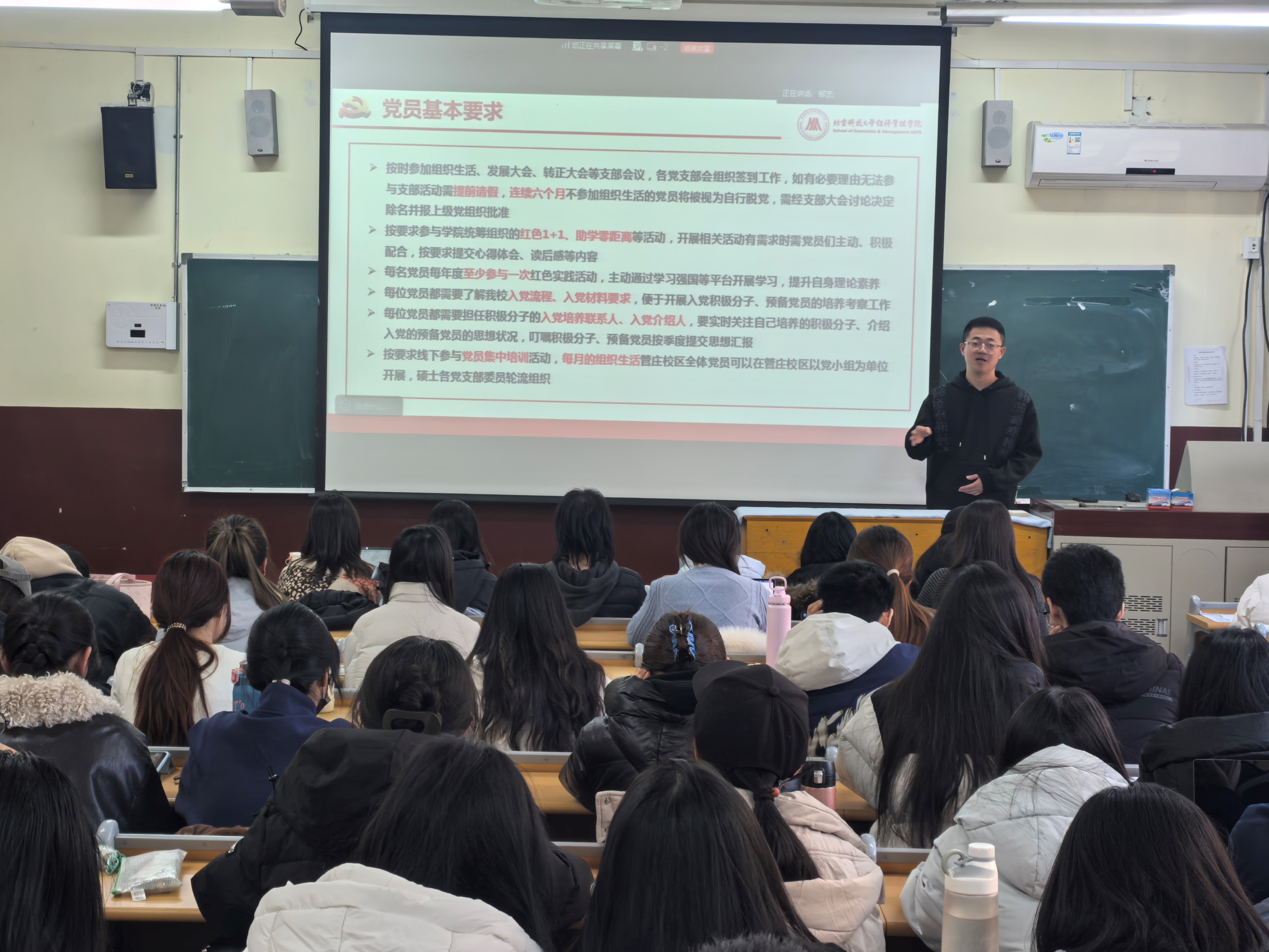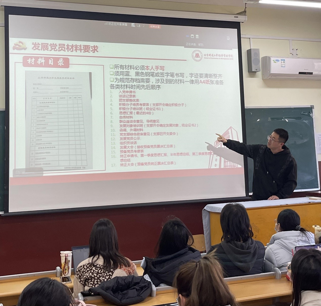 2025年12月4日下午13:00,bat365官方网站在管庄校区教学楼204组织开展新生党员及入党积极分子培训活动,旨在系统介绍党员发展规范及材料要求,强化学生党员的政治素养与纪律观念。活动由学院辅导员邹艺主讲,全体研25级新生党员及入党积极分子参加。