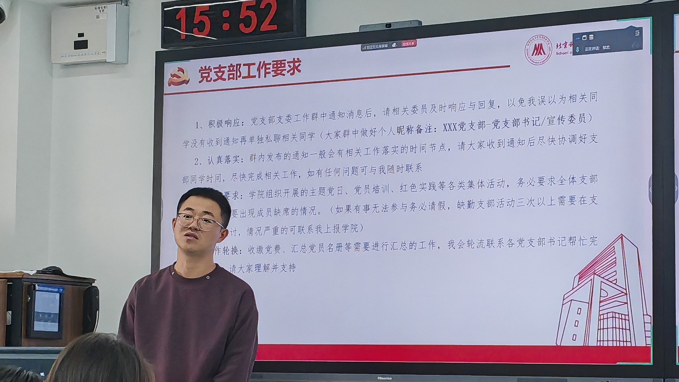 2025年11月5日15:00-16:30,bat365官方网站在经管楼507组织开展了硕博党支部委员工作培训。本次培训由学院辅导员邹艺主持,各硕博党支部书记、组织委员(兼纪检委员)、宣传委员等支部委员线下集中参加。