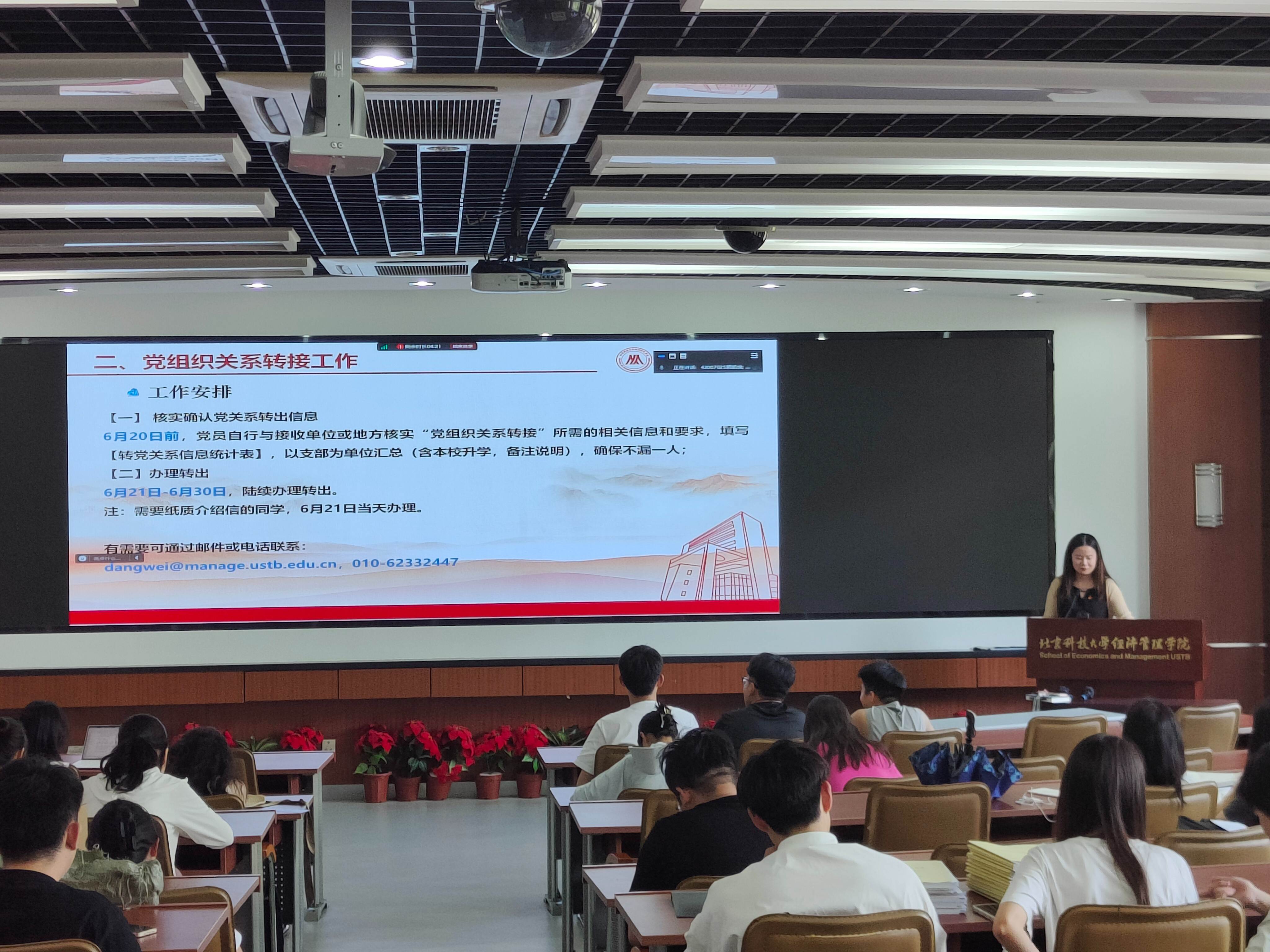 随后,张晓佳老师详细介绍了党组织关系转接的工作安排和注意事项。认真做好毕业生党员组织关系转接工作,是加强对党员教育管理监督的重要举措,也是提升学生党员党性意识的至关重要环节。张晓佳老师针对党组织转接关系中“党员材料”“党员组织关系介绍信”这两项重要内容进行详细讲解,以确保每一位毕业生党员都能够熟悉党组织关系转接的具体流程。最后,张晓佳老师还对同学们提出的问题进行耐心解答。