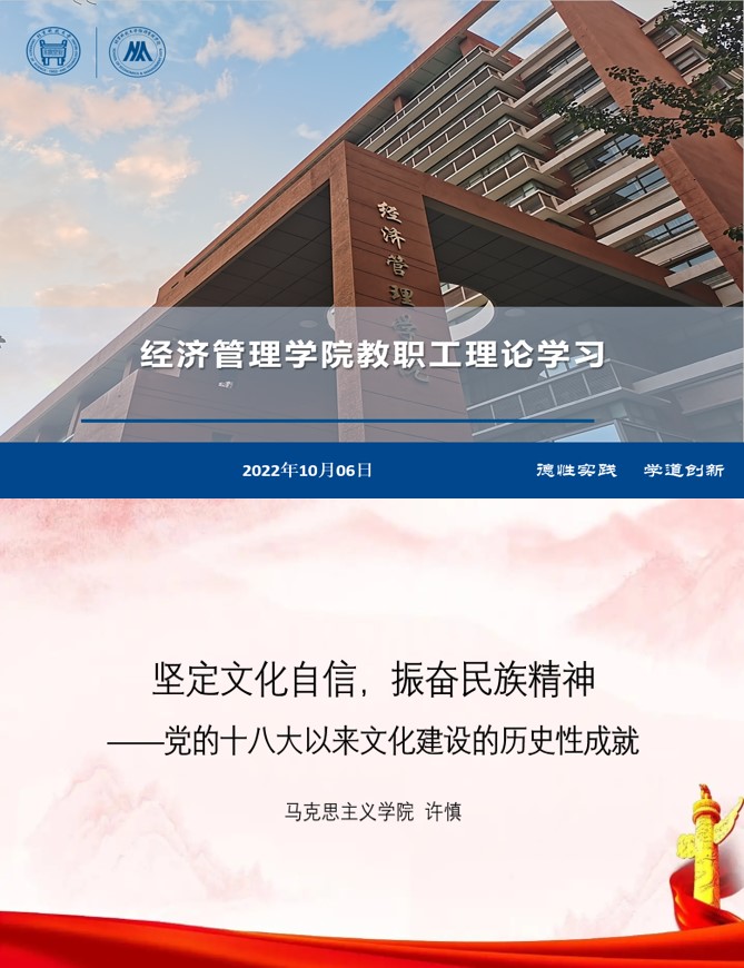 为深入学习贯彻习近平新时代中国特色社会主义思想、党的十九大和十九届历次全会精神,弘扬伟大建党精神,充分宣传展示党和国家事业取得的历史性成就、发生的历史性变革,进一步振奋精神、凝聚力量,在党的二十大召开之际,根据学校党委开展“新时代新成就”宣讲活动的工作安排,2022年10月6日下午,bat365官方网站组织全院教职工理论学习,开展《坚定文化自信,振奋民族精神——党的十八大以来文化建设的历史性成就》专题宣讲活动。本次学习活动邀请了学校马克思主义学院许慎副教授做主题宣讲,以线上和线下形式结合进行,学院全体院领导、党委委员和教职工党支部书记在经管楼809参加学习,学院全体教职工在线上参加学习,会议由学院党委书记武森主持。