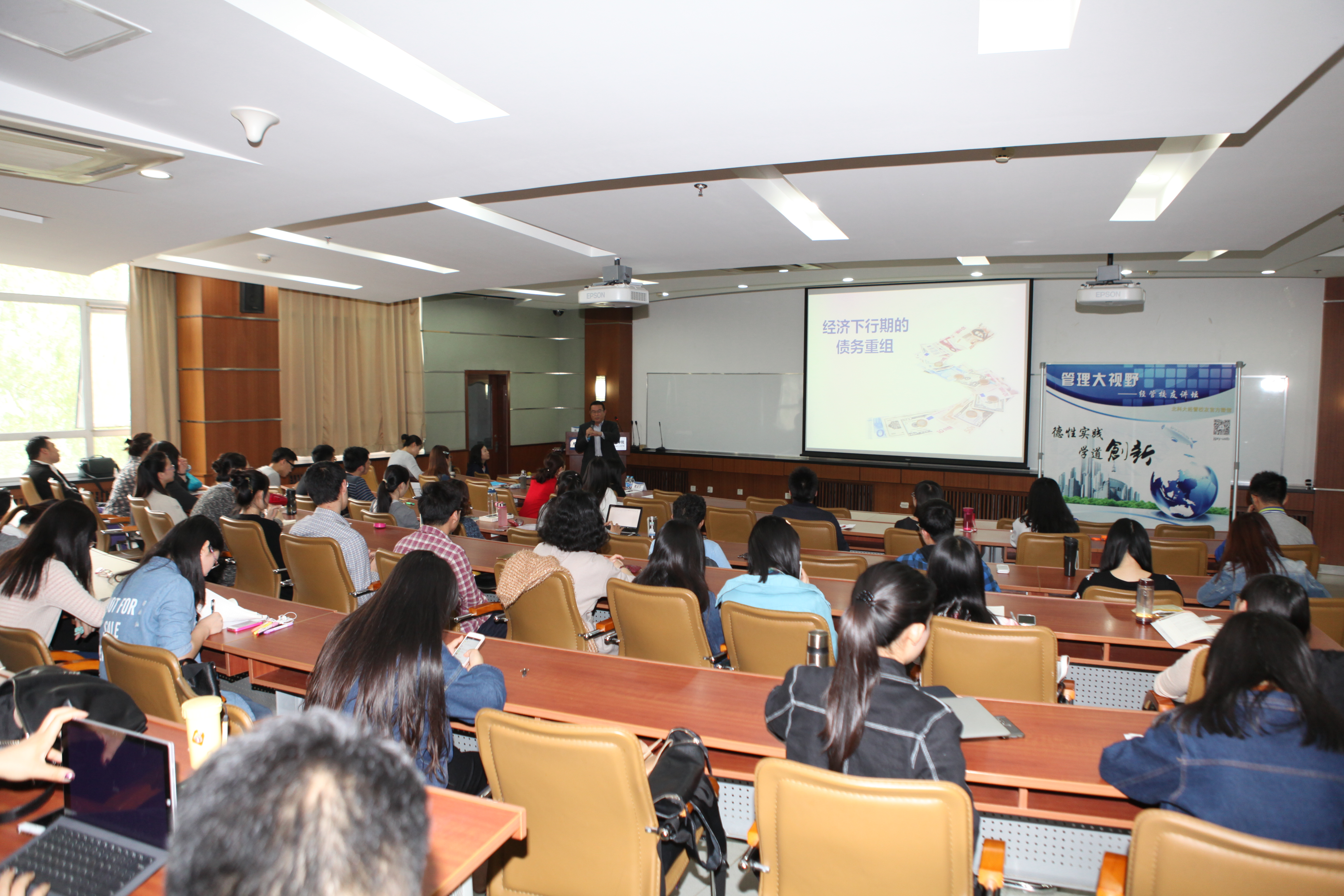 下午3:30活动开始。党委书记戴淑芬介绍了主讲校友和经管校友讲坛系列活动,之后讲座开始。赵伟校友以亲身经历的四个典型案例为线索,简要介绍了债务重组的相关知识和实务操作。