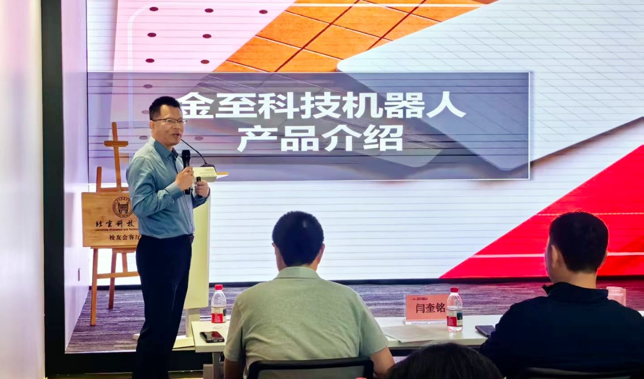 冶金90级校友、金至科技股份有限公司董事长魏占良,向与会人员全面介绍了智慧机器人在工业场景中的深度应用现状与发展趋势。他着重分享了公司研发的自动喷漆机器人,该机器人凭借在提高工作效率、提升喷涂品质以及减少环境污染等方面的卓越性能,赢得了校友们的广泛关注与高度认可。