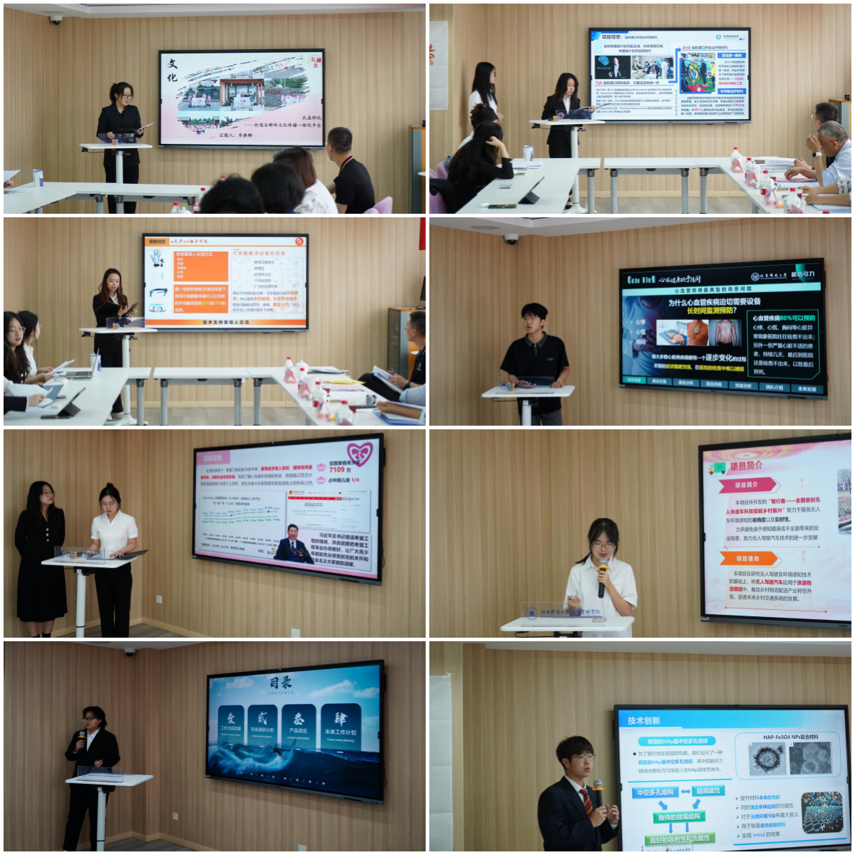 此次参与中期答辩的团队一共有八支,分别是得芯应手--应对脑卒中术后手功能障碍康复的解决方案团队、豪不“磷”吸--羟基磷灰石多空纳米新型复合材料团队、心路教育--以大学生资源助力教育资源不均衡孩童团队、启迪视界--一体化指令式智慧导盲系统团队、core ring--指环型微型心电仪团队、“手曰”多功能手语识别系统团队、科技赋能--无人快递车智慧助农探索实践团队、孔孟好礼--打造全新的文化传播一体平台团队。