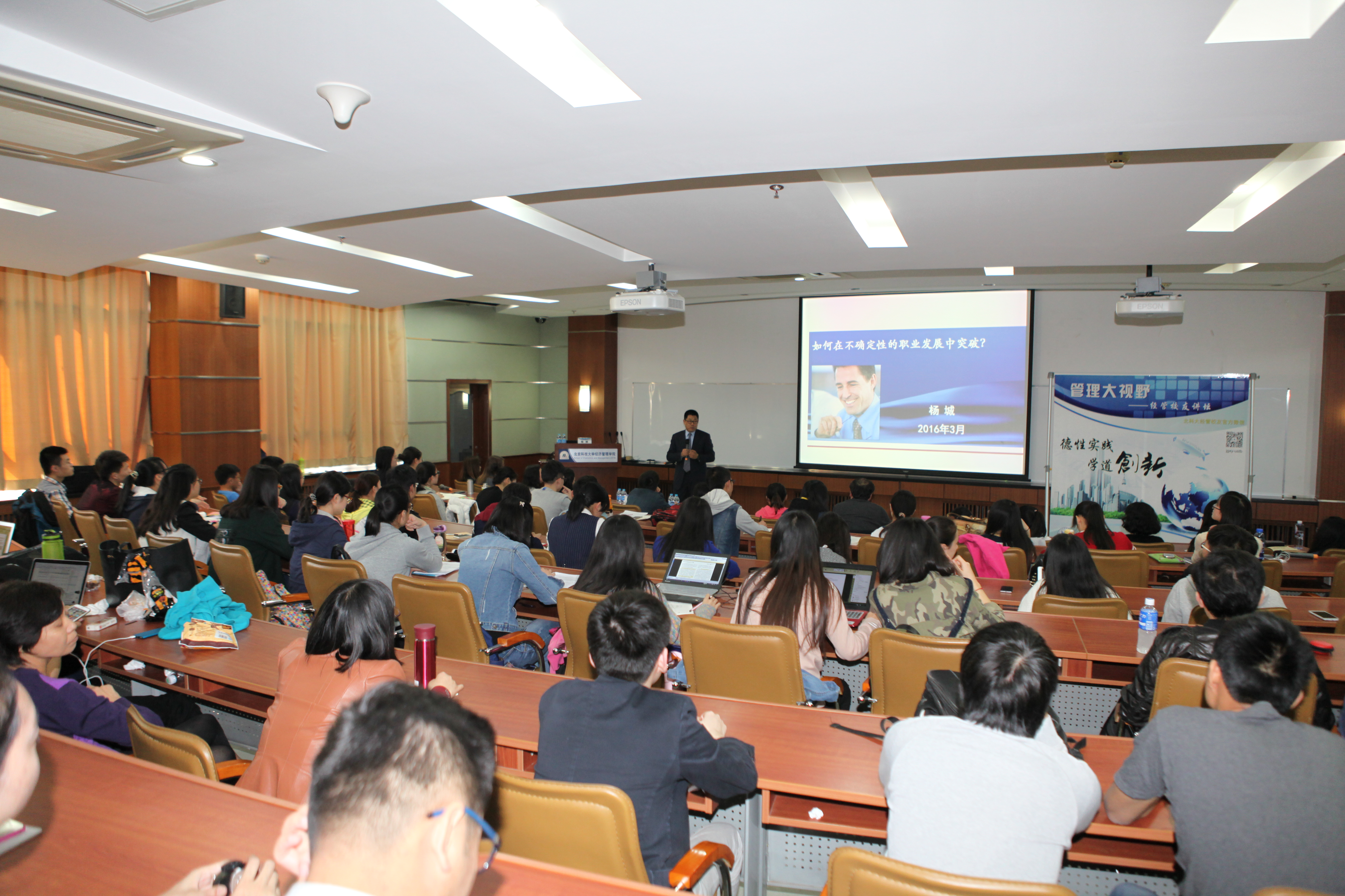 2016年3月30日,东凌经管学院35周年院庆纪念活动之“管理大视野—经管校友讲坛”第十二讲在经管楼312教室举办。本期讲座主题为“如何在不确定性的职业发展中突破”,主讲嘉宾为我院MBA2002级校友杨城。杨城校友目前就职于万年基业控股集团公司,任助理总裁兼万年基业文化旅游产业集团人力资源管理合伙人。