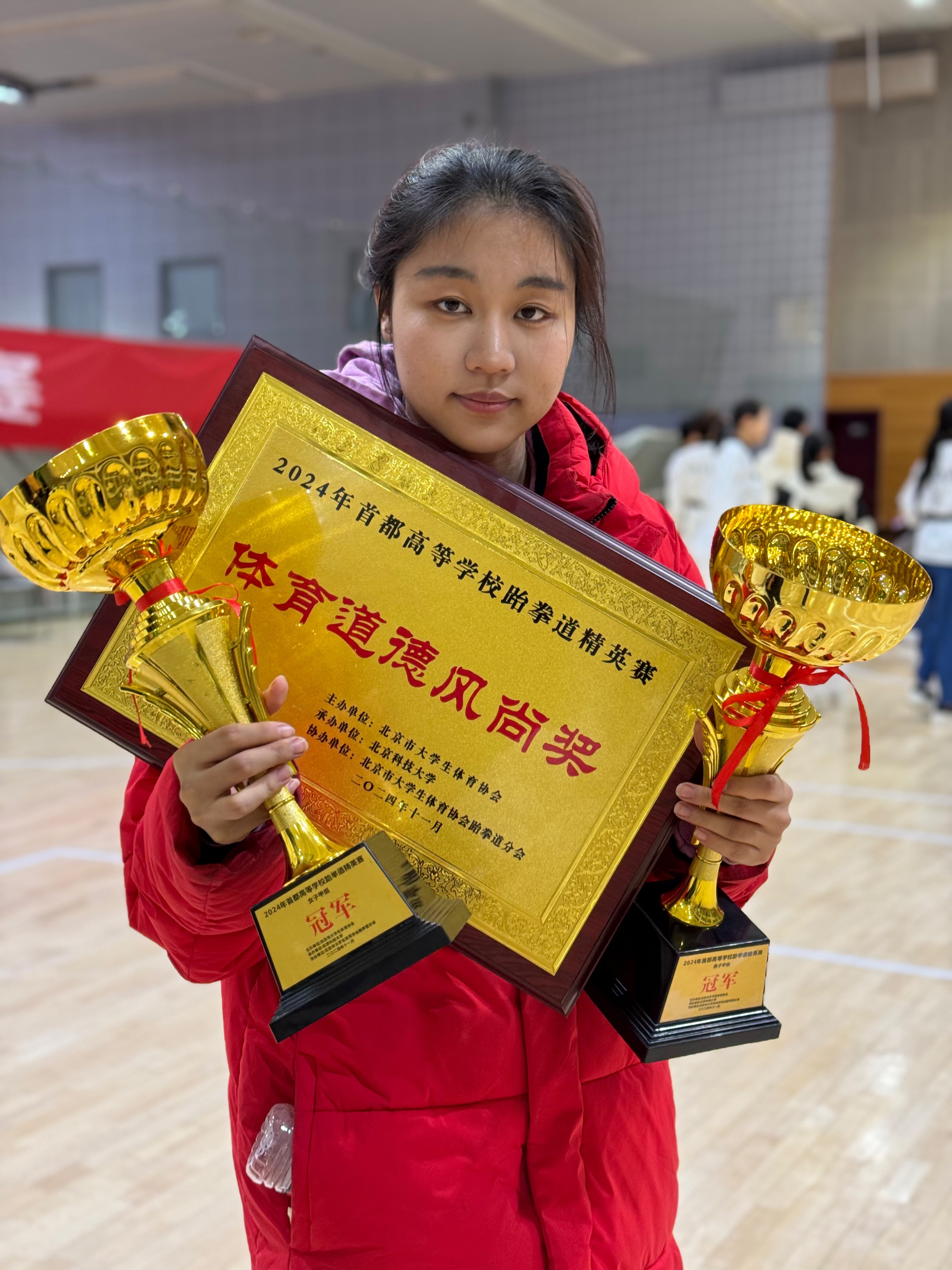 作为一名高水平跆拳道运动员,她在竞技场上演绎着“以柔克刚”的哲学——首都大学生跆拳道锦标赛女子67kg冠军的桂冠,全国大学生锦标赛女子57kg第五名、品势团体冠军、品势混双亚军、品势个人季军等是对日常训练中万次踢靶的最好证明。
