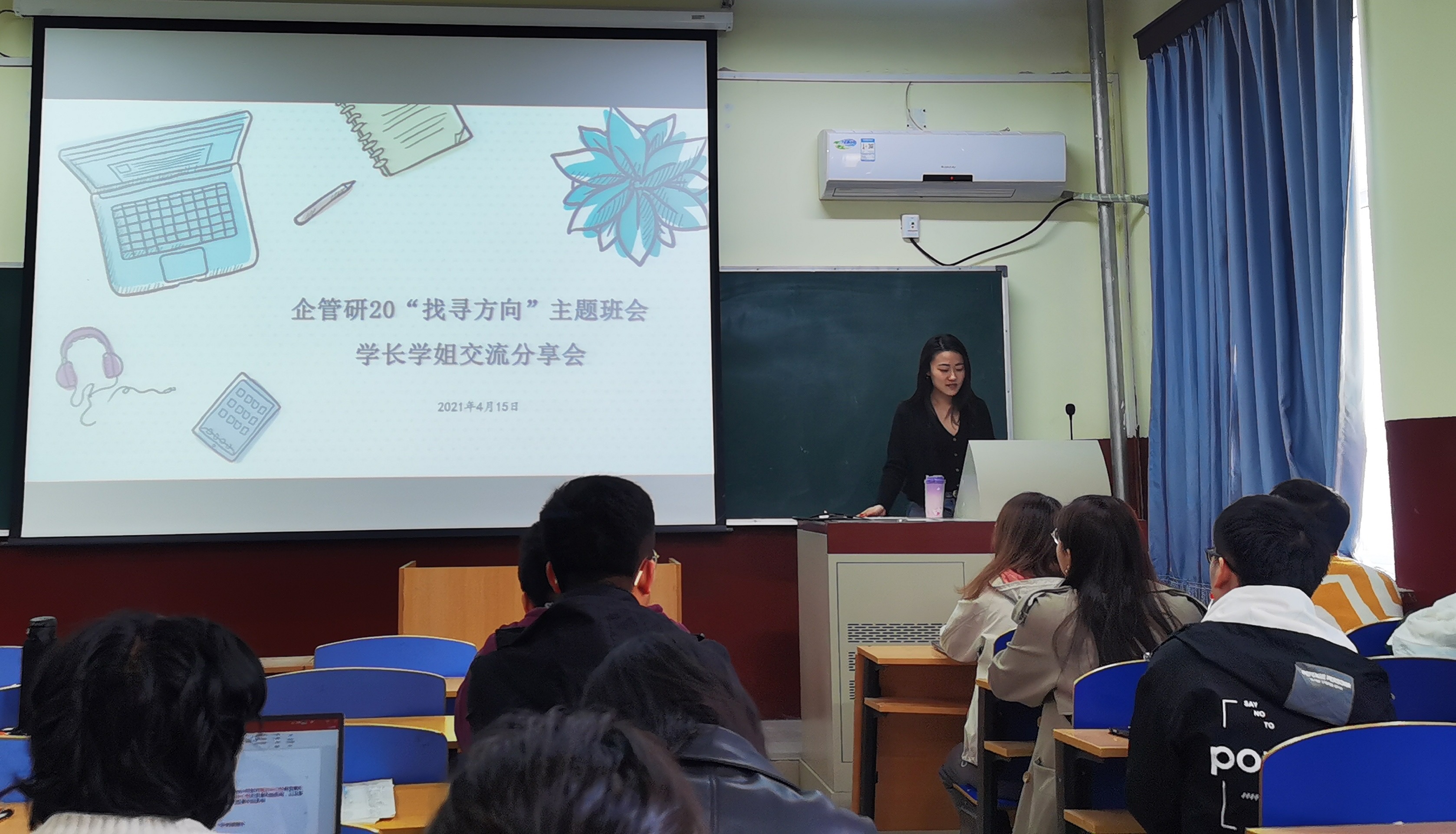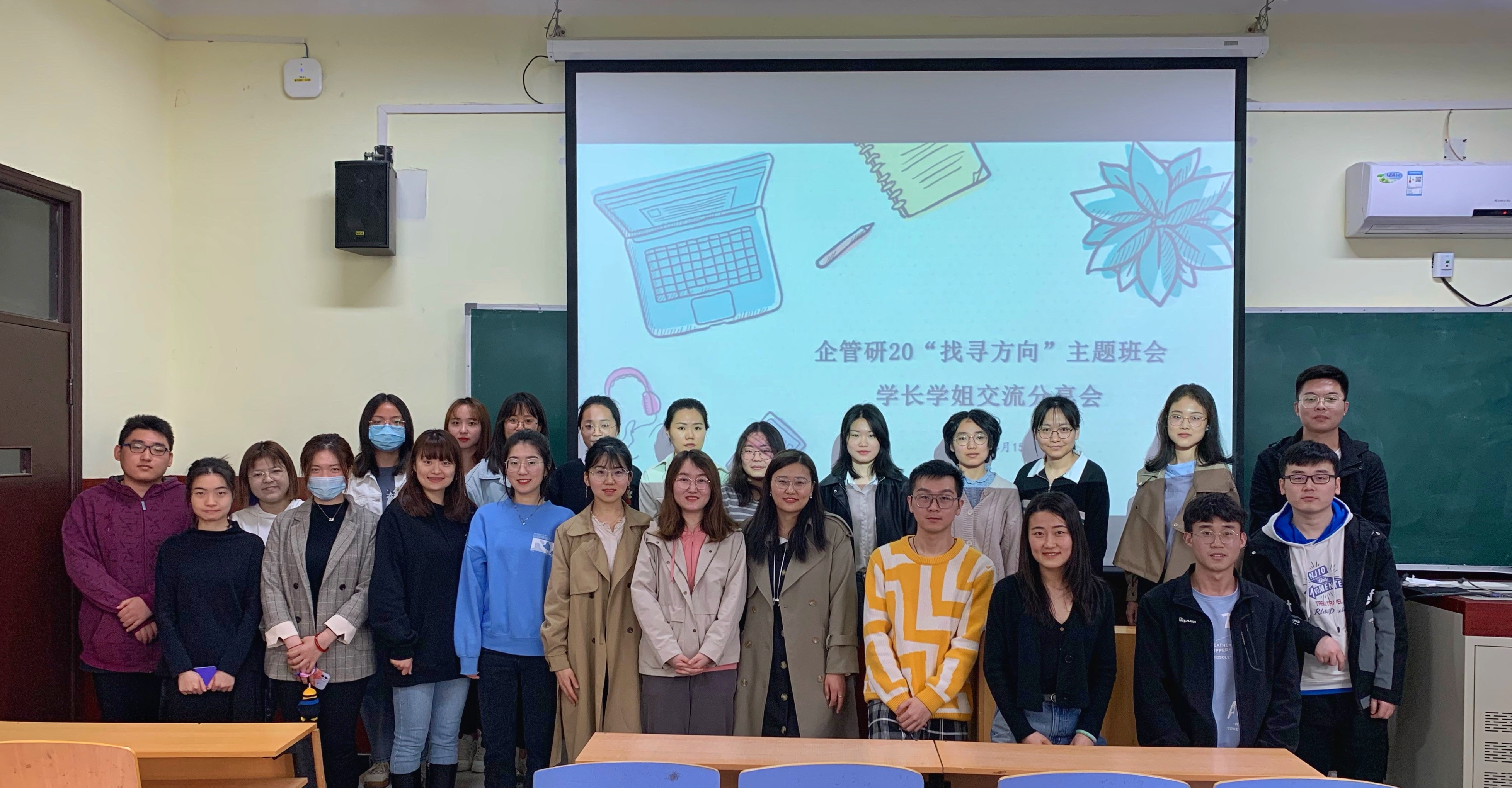 4月15上午10点,企管研20“找寻方向”主题班会暨学长学姐交流分享会于bat365官方网站管庄校区教学楼203举办,分享会由辅导员李响主持,企管专业的楚中柱、李柱等学长学姐与企管研20级全体学生参会。