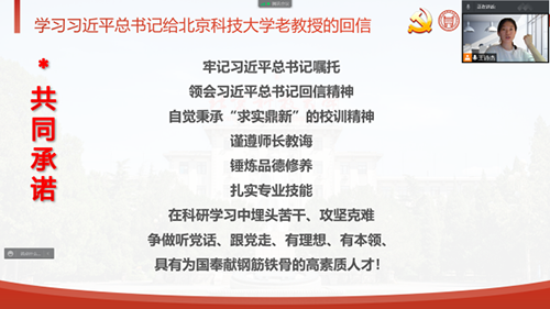 接着,党支部全体成员依次发言交流学习感想。这是北科大收到的第二封习近平总书记的回信,党支部全体成员纷纷表示感到十分激动与荣幸。郭新莹同志表示:“我点开回信,不仅看到了学校发展路程的艰辛,也看到了习近平总书记对我们学生未来发展的关切,我们一定要发扬北科求实鼎新的校训精神,为实现中华民族的伟大复兴奋斗目标不断进取。” 乔越洋同志表示:“习近平总书记的回信让我们北科大全体青年备受鼓舞,老教授们开创了新时代中国的钢铁时代,我们作为新一代的钢铁青年,更应如此,接过老教授们手中的接力棒,将求实鼎新的精神刻进我们的钢铁强心,实现科技强国,再创时代辉煌。”