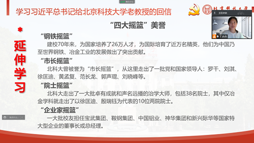 然后,共同观看建校70周年宣传片选段,结合校史展开延伸学习。我校校徽由两个同心圆构成,内环以“鼎”为主体造型,外环嵌入校训“求实鼎新”,体现了我校的学科背景、行业特色、和文化根源和学校建校以来引领钢铁行业发展、支撑国家工业化建设的卓越贡献。我校享有“钢铁摇篮”“市长摇篮”“院士摇篮”“企业家摇篮”等“四大摇篮”的美誉,建校70年来,为国家培养了一批党和国家领导人、38名院士、一大批企业家等在内的26万人才。北科学子也有“铁小伙、铁姑娘”的别称,希望男生如高强度高硬度的钢般正直刚强,女生如柔软可塑的铁般温柔热烈。
