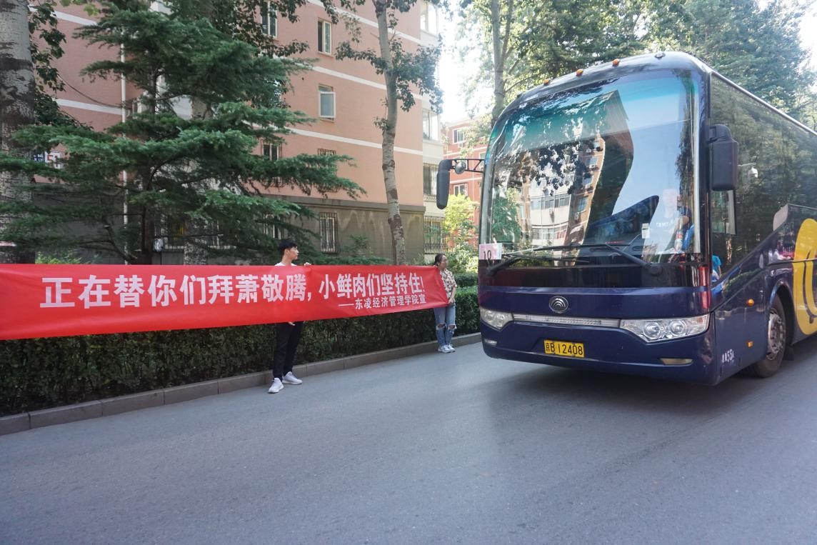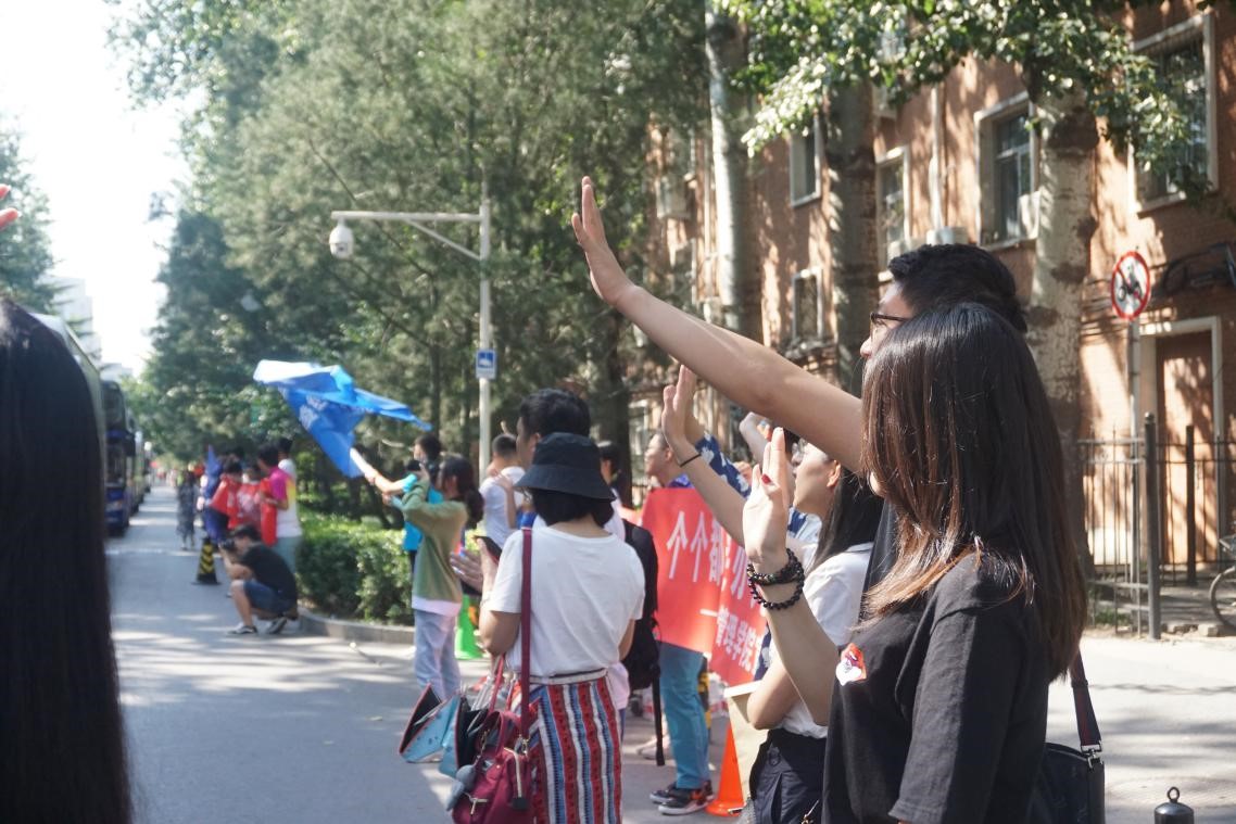 新生们整装待发,院领导、老师和学长学姐们路旁欢送。通往北门的大道上,学长学姐们拉起精心准备的条幅,一辆辆大巴车驶出校门,向着目的地——怀柔军训基地进发!他们将在那里度过辛苦却美好的十几天,这定会是小贝壳们人生中一段难忘的回忆。