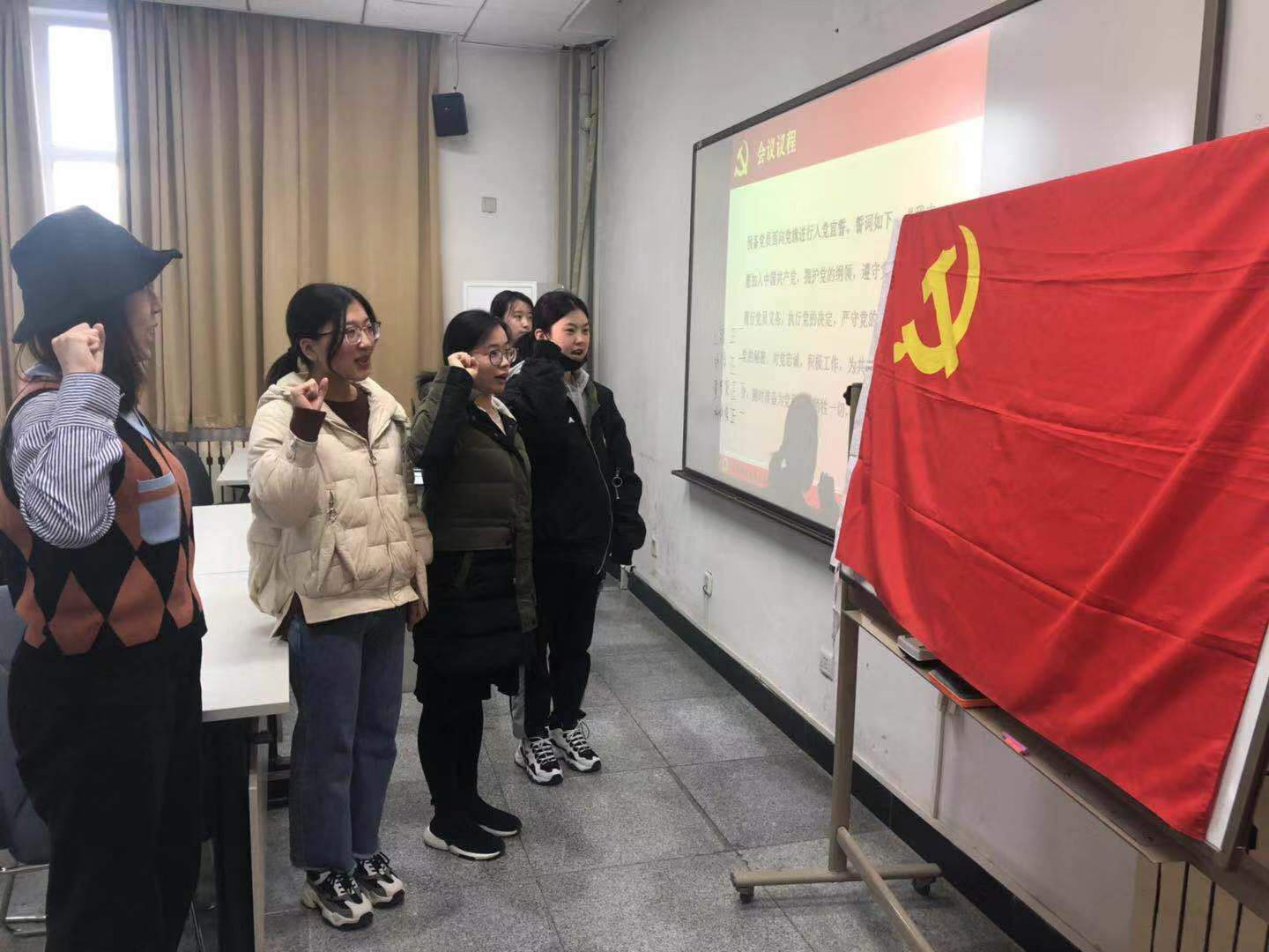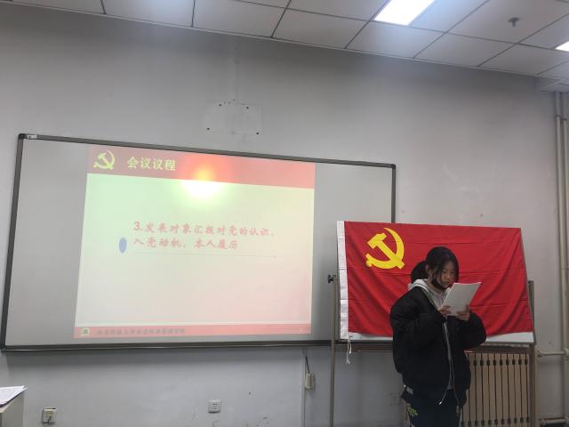 发展党员严格按照党员发展程序,由入党申请人逐一进行入党志愿书的宣读以及自己一年来的表现做思想汇报。申请入党的同学都真情的表达了对党的向往,随后介绍人分别介绍预备党员的表现,党支部大会讨论,投票表决,四名同学光荣地成为中国共产党员。