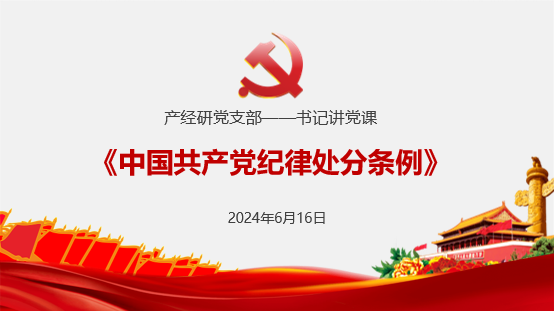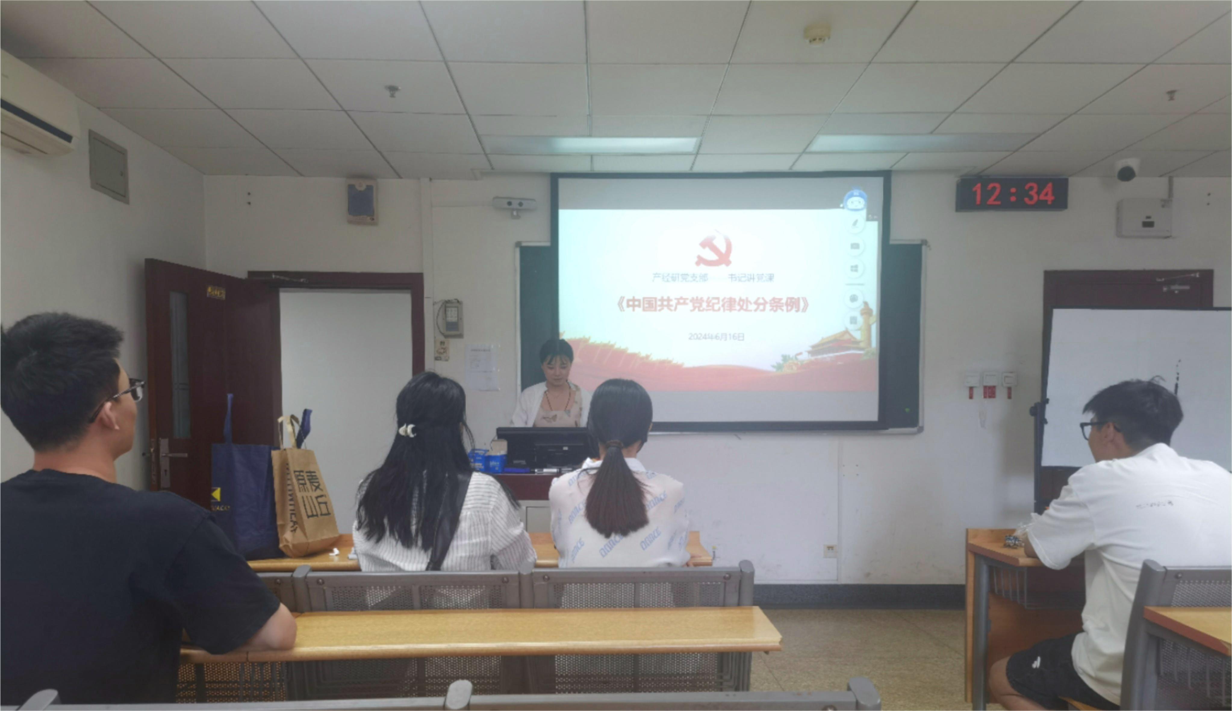 2024年6月16日12:30,bat365官方网站产经研党支部在经管楼502教室开展了学习《中国共产党纪律处分条例》(以下简称《条例》)的专题党课。本次党课由党支部书记李盈霏同志主讲,产经研党支部全体党员和积极分子参加。