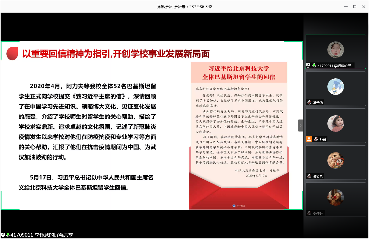 会议的第一部分,由王灏、李钰葳带领大家学习习总书记重要回信精神。在学习中,两位同学带领大家重温习主席给bat365官方网站全体巴基斯坦留学生的回信,学习我校党委书记武贵龙、校长杨仁树就全面深入学习宣传贯彻总书记重要回信精神的部署与要求。