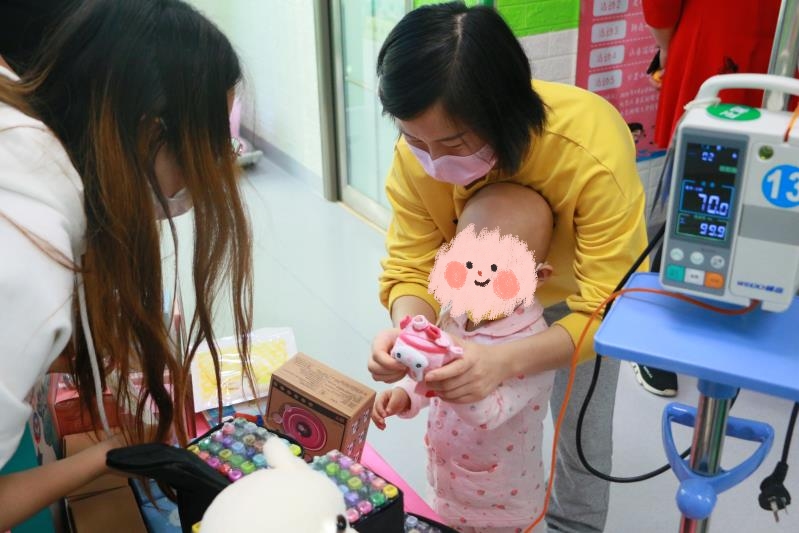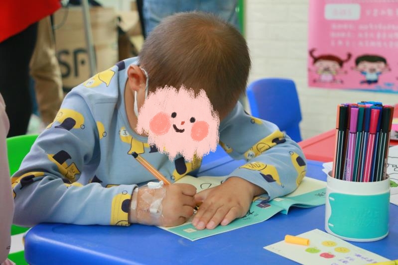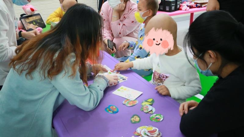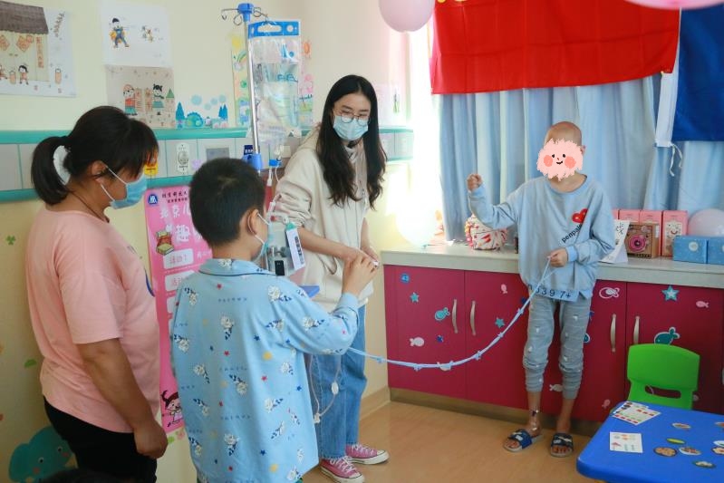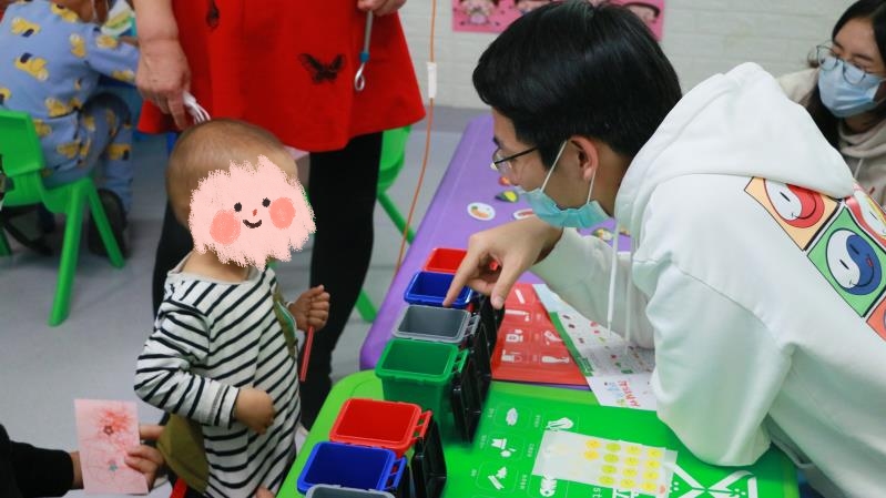 垃圾分类游戏。虽然小朋友每天都在医院接受治疗,不能去学校,但是他们依旧好学,垃圾分类的知识都有所了解,看着他们快速掌握,正确地把垃圾扔进对应的垃圾桶里,为他们感到高兴。