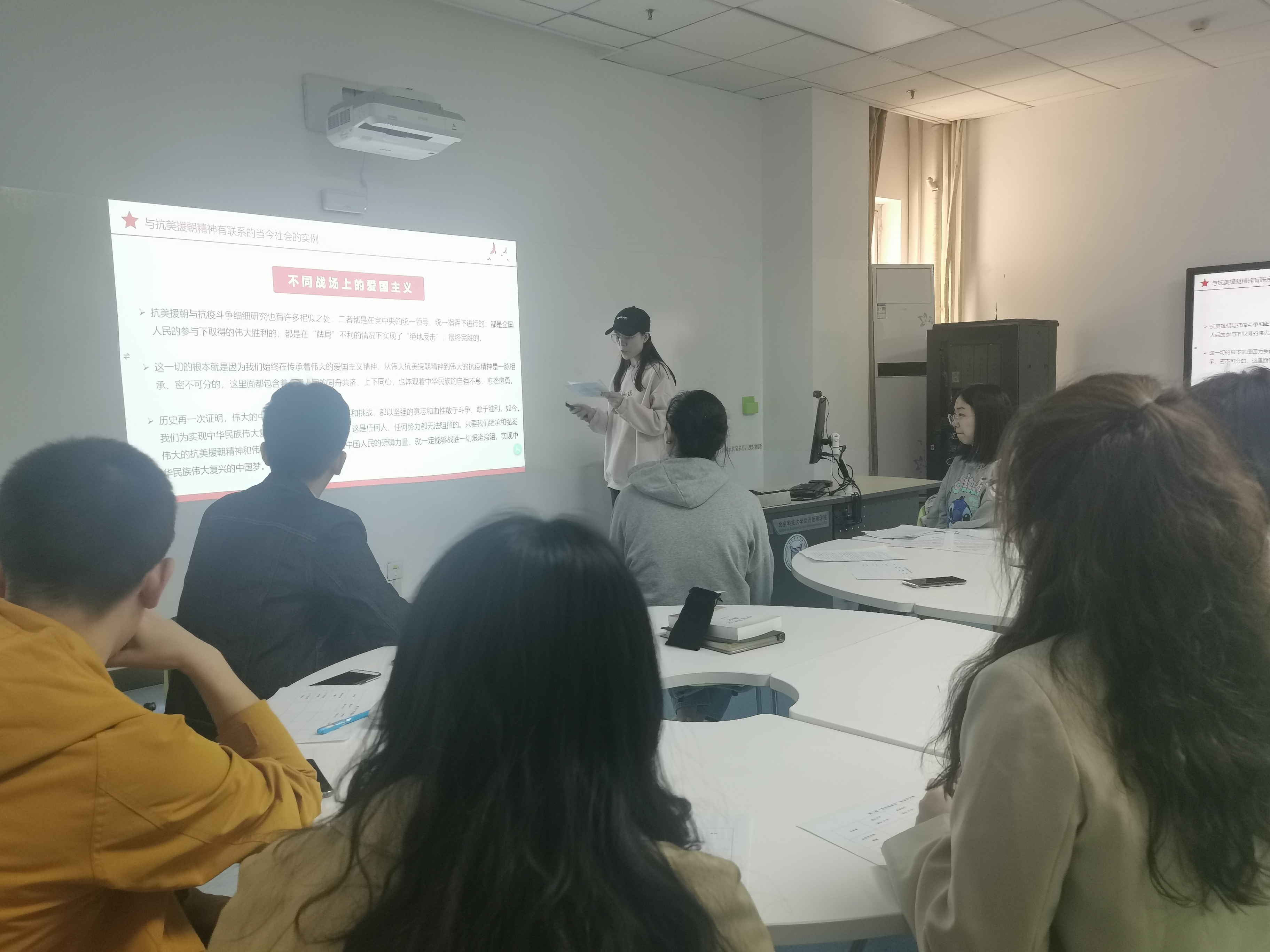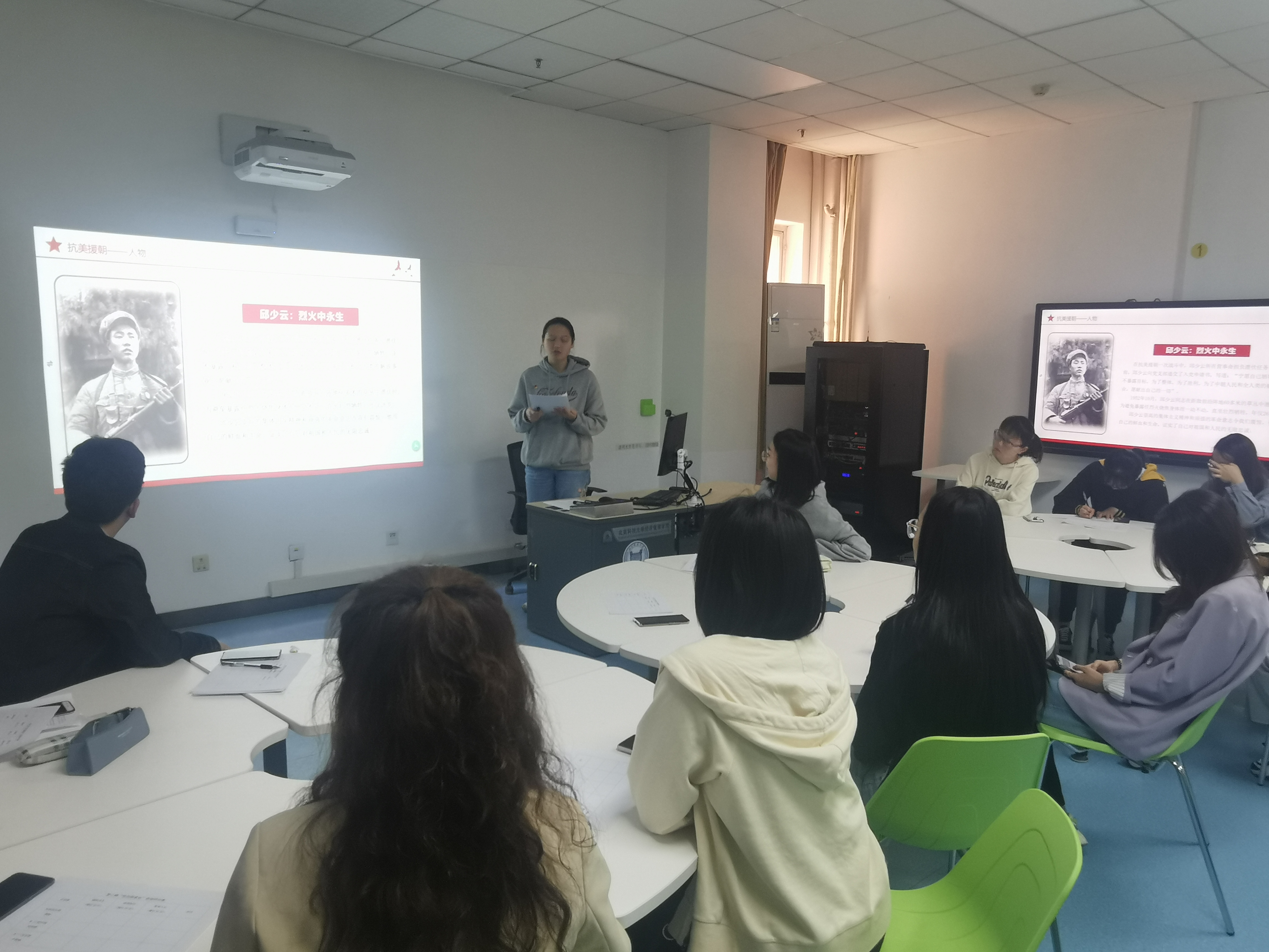 第二场分享由本17党支部党员于舒涵和刘庆超共同完成,她们分享的主题是“抗美援朝——爱国主义精神”,于舒涵通过讲述抗美援朝战争中志愿军战士的英雄故事,引出流淌在中华儿女鲜血中的爱国主义精神,抗美援朝战争不仅做到了保家卫国,还对国内资本家和知识分子的思想改造产生了积极影响。