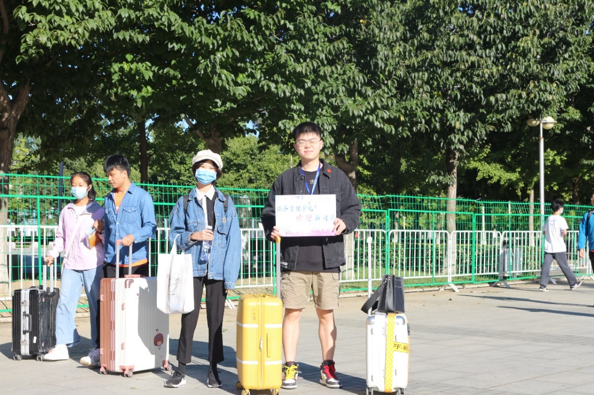 由于疫情原因,小贝壳们的家长不能进入学校。考虑到行李问题,经管学院贴心地为每一位小贝壳配备了一位专属志愿者帮忙引导流程、搬运行李、实现了一站式迎新服务。志愿者们积极与新生沟通,提前迎着烈日到学校门口等待新生的到来,积极帮助新生搬运行李,介绍校园,让新生在热情与温暖中开启全新的大学生活。