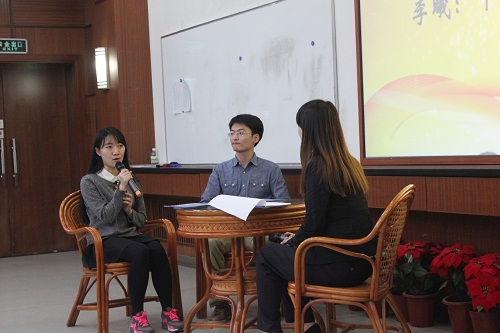 其中优秀的学长学姐们为我们分享了他们的成功经历,并且和现场同学就就业,保研和学生工作方面进行了经验交流。毛健学长谈到在投简历和面试之前要做好充分的准备,实习时从基础工作做起;李曦学姐谈到兴趣是最好的老师,考取证书时要有选择,在投简历时需要信心和恒心;王俊鑫学姐谈到大一大二要为保研做好知识准备,尤其是英语成绩很重要,大三争取进入高校夏令营获得保研资格;杨佳丽学姐谈到学生工作可以提高学习的积极性,二者的关系在于态度问题,学生工作可以学会如何沟通。在此过程中,现场同学踊跃提问,问题包括实习工作的选择,英语的学习方法和保研所需要的具体条件及时机等。对于这些问题,学长学姐们都从自身经历出发,作出了回答,现场气氛十分热烈。