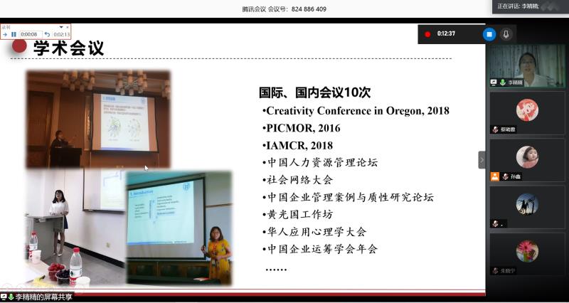 会议伊始,主持人介绍答辩要求和评审规则,随后六位答辩选手根据会前抽签顺序逐一展示。李精精从自身的研究兴趣与特色入手,展示了丰富的科研成果,同时她介绍了参与的学生工作,全方位展示自我。潘飞则是对自己的研究领域进行了详尽的介绍,尽显其专业素养。