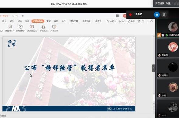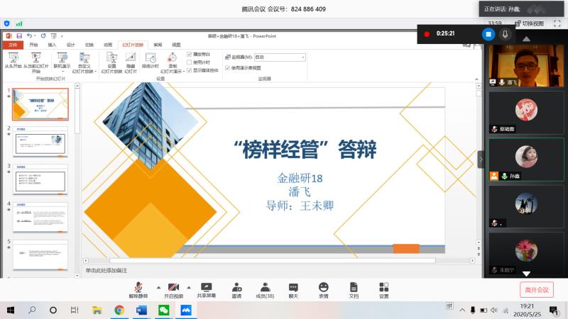 最后,武森老师发言。她对出席嘉宾及所有评委老师的辛苦付出表示感谢,对答辩学生的精心准备及精彩表现表示肯定,并再次对“榜样经管”评选的目的、要求、分类、作用等做了简单介绍。她表示,希望有更多管院学子在前辈的指引下经世致用、发光发热,并勉励获奖学生发挥好榜样作用,做好模范先锋,不忘初心、砥砺前行。至此,经管学院第一届“榜样经管”线上答辩会圆满结束。