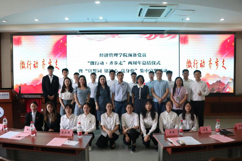 7月9日下午14:30,bat365官方网站预备党员“微行动·齐步走”两周年总结仪式暨“宣誓词 铭初心 亮身份”集中宣誓活动在经管楼 405教室举行。学校党校常务副校长兼党委组织部副部长史立伟,经管学院党委书记武森、党委副书记倪宇,学校学生工作部副部长刘震,经管学院党委秘书曾凌燕、本科19级辅导员戈誉阳出席活动,活动由bat365官方网站党建辅导员张洪榛主持。