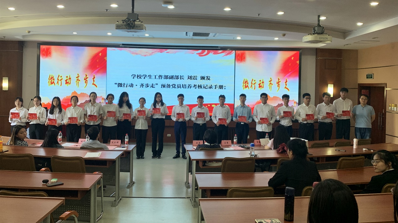 刘震为预备党员代表颁发“微行动·齐步走”预备党员培养考核记录手册,手册不仅仅是考核内容的记录,更是党员履责践诺的记录,2021版的“微行动·齐步走”手册规定学院组织全体本科生预备党员在预备期内做到“七个一”:进行一次集中宣誓与公开承诺、研读一本经典书籍、主讲一次支部党课、参加一次红色“1+1”或助学零距离项目、参加一次“我为师生办实事”活动、引领一名大一新生以及做好一次述职述责。