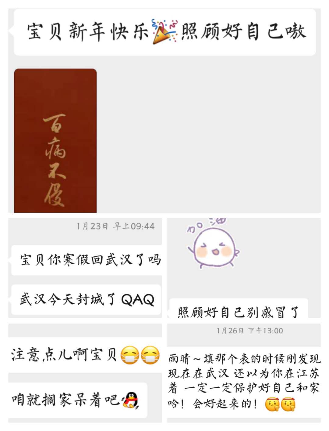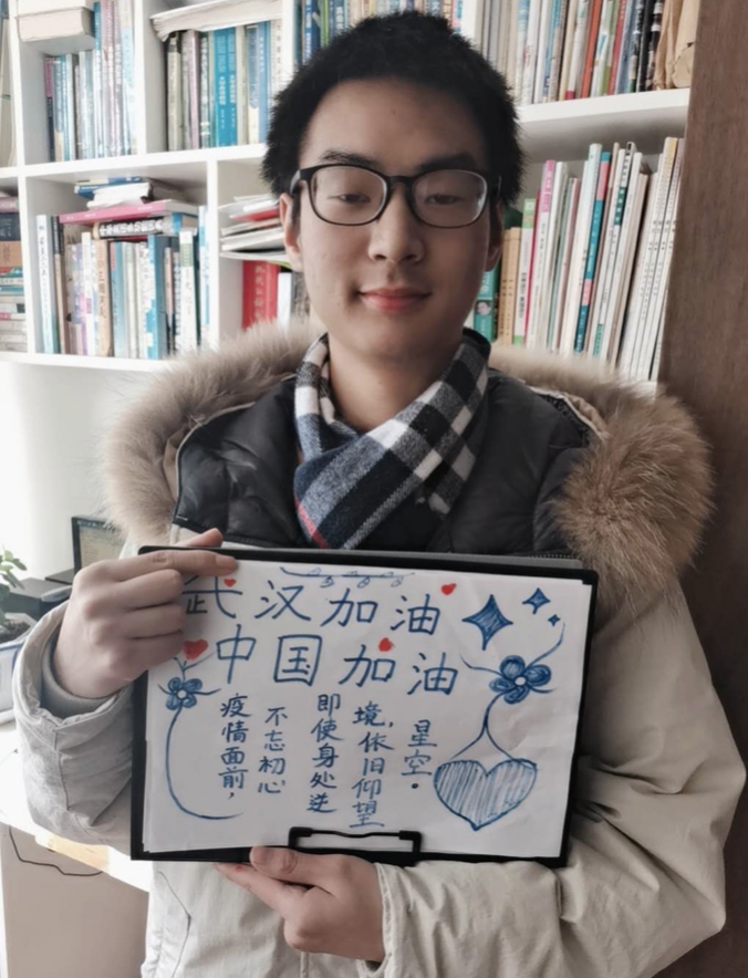 “2020,本应是一个“爱你爱你”的幸福年,但随着疫情的蔓延,微博、微信平台的各种消息都让我揪心不已。作为一名普普通通的大一学生,我只能和家人闭门不出,隔着屏幕默默为武汉加油、为中国祈祷。”