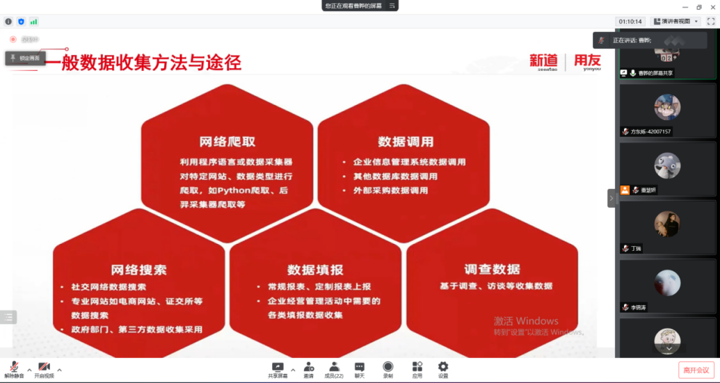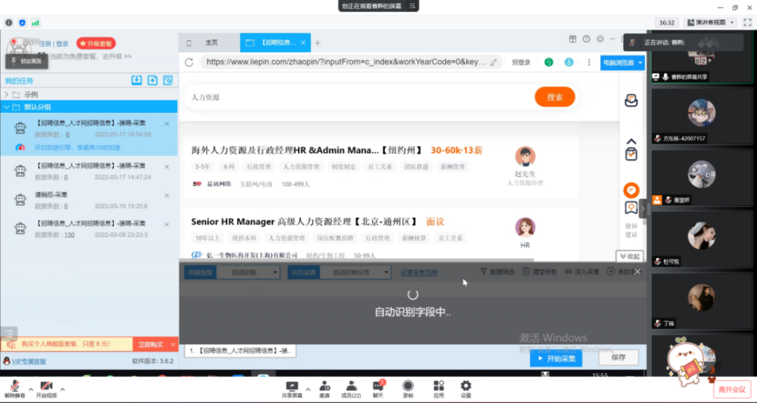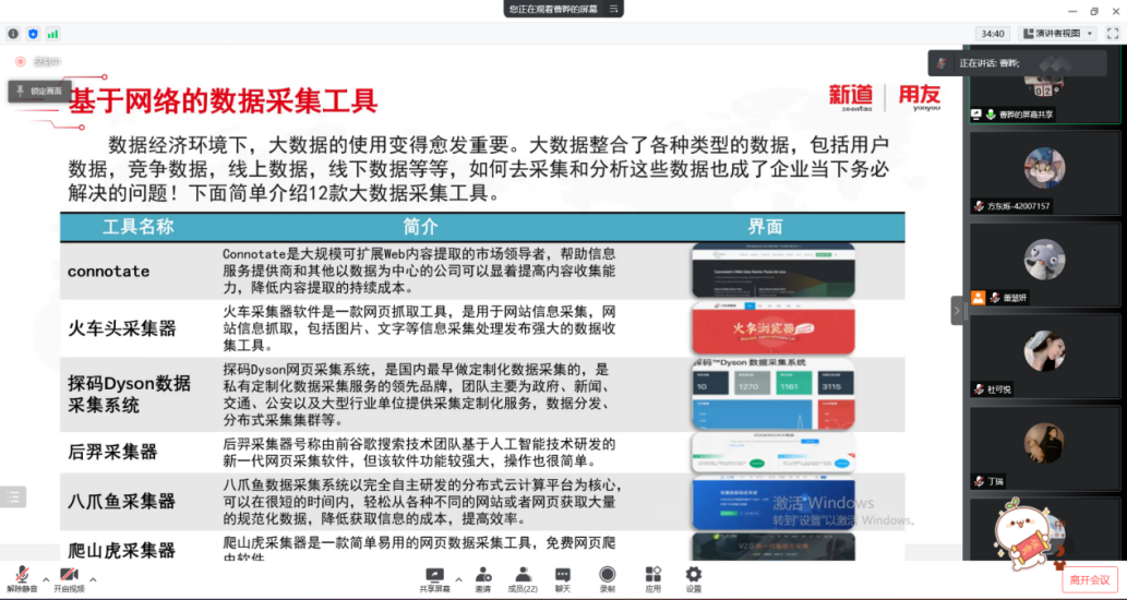 2022年3月17日,bat365官方网站工商管理系“人力资源大数据实践项目”开展了第二次课程教学。按照疫情防控期间相关要求,本次授课依旧采取腾讯会议的方式进行,有幸邀请到新道科技股份有限公司高级讲师曹晔进行讲授。同学们对曹老师的上课方式已经有所熟悉,和着老师的讲课节奏,课程进度十分顺利。曹老师对同学们的大数据基础进行了摸底测试,紧接着便开始了“干货”的教学——数据清洗与数据挖掘。曹老师从大数据来源、数据结构类型和一般数据收集方法与途径这三个方面进行了讲解,并带领同学们进行了数据爬取的实操。