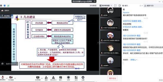 在讨论交流环节,与会师生就“双碳”政策下钢铁产业的发展、中国钢铁产成品出口等问题与李拥军研究员进行了积极讨论。应用经济系主任冯梅老师对李拥军研究员的学术报告进行了总结与感谢,希望李拥军研究员能够继续支持国际经济与贸易国家级一流本科专业建设的工作,期待在未来能开展进一步的学术交流和科研育人合作。