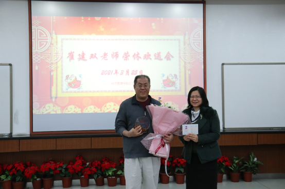 仪式最后,学院党委书记武森代表学院向崔建双老师赠送了学院专门定制的荣休纪念牌和鲜花。荣休纪念牌基座为琉璃帆船造型,祝愿崔老师带着学院浓浓的人文关怀,退休生活一帆风顺。