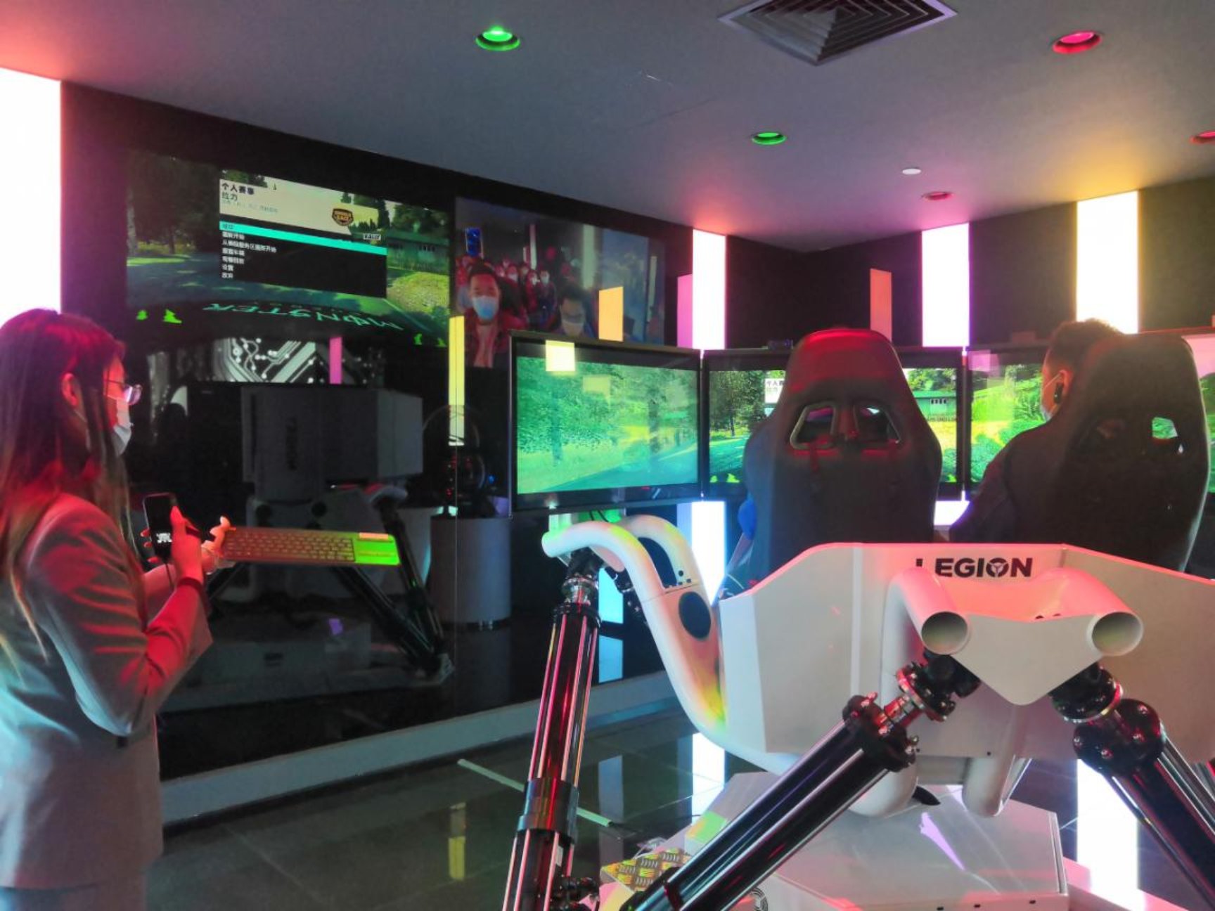 (图片:集中班两名同学体验联想未来中心的专业电竞游戏设备)