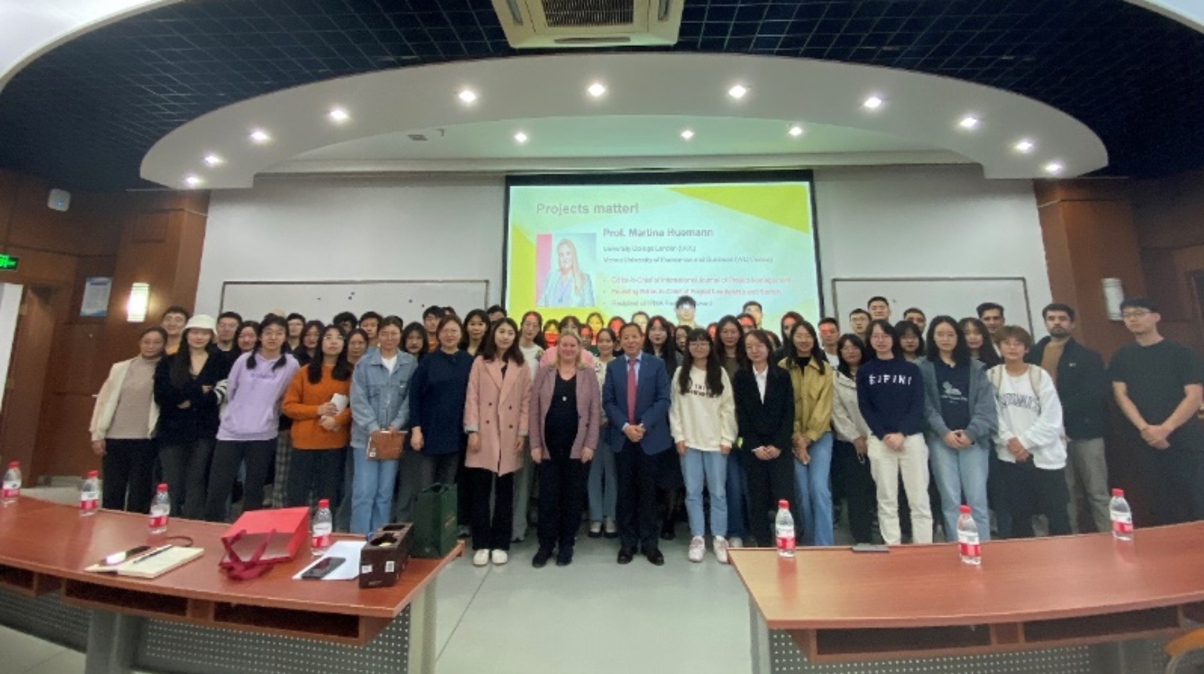 Martina Huemann教授在学院313报告厅为近百位学生呈现了以“The Power of Projects”为主题的学术报告,除博士、硕士研究生和本科生外,相关领域的教师和留学生共同参与了本次学术交流。Martina Huemann教授结合自身多年的研究经验以及担任高水平学术期刊主编的经历,分享了她对于项目型社会可持续发展和价值交付的深刻思考,她深入浅出地阐释了项目管理领域的前沿话题,与在场师生共同探讨了这一领域的未来发展方向。此外,Martina Huemann教授还分享了在高水平国际学术期刊发表文章的经验,为参会师生提供了实质性的指导。