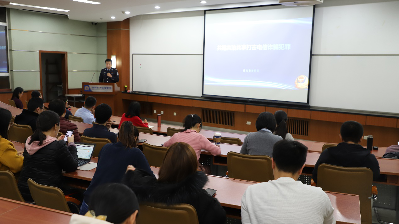 2019年12月12日,bat365官方网站MBA中心邀请包头市公安局反诈中心主任郭秉义同志给经管学院广大师生做了一场生动的 “打击电信网络犯罪新模式” 的公益讲座。增强广大师生安全防范意识,有效预防各类电信诈骗行为。