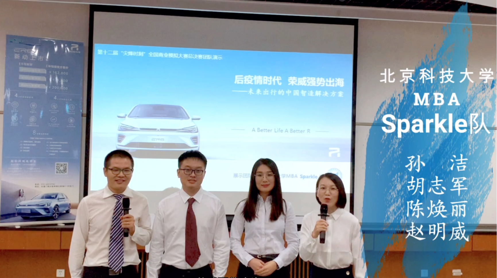 学院MBA中心也给予了参赛队伍极大的支持,在疫情期间特地向学校申请了一间教室供参赛学子使用。“Sparkle”团队在胡玲老师的指导下,将课堂所学与实际情况相结合,处变不惊,沉着应对挑战。在经过数天的熬夜奋战,制定了一套极具创意的可落地的解决方案,甚至还为案例对象荣威ER6制作出了一款小游戏,最终在商业视频演示环节收获了评委和观众的认可和赞扬。