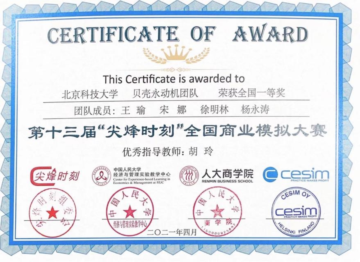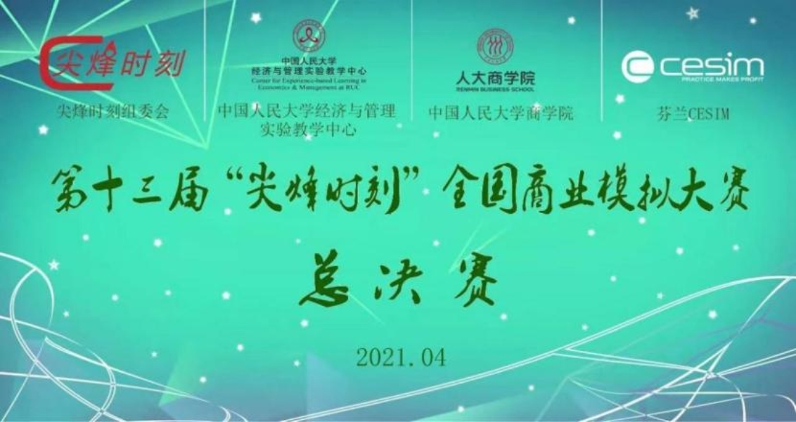 尖烽时刻大赛源于北欧的全球知名商科模拟大赛PEAK TIME,每年吸引众多来自世界各国的优秀学生参与,现在已经成为在欧洲最大规模的国际模拟竞赛,也是全球顶尖商学院学生进行交流合作的一大盛会,自2008年引入中国至今,已成功吸引全国各大顶尖高校积极参与。第十三届“尖烽时刻”全国商业模拟大赛,由教育部工商管理类专业教学指导委员会全程指导,中国人民大学商学院和人大经济与管理实验教学中心承办,来自全国21所985高校和39所211高校在内的150余所高校参赛,本科组和MBA/研究生组别共1400 支团队参加,最终76所院校、77支团队胜出并参加总决赛。2021年4月7日至4月11日总决赛通过zoom平台线上举办。