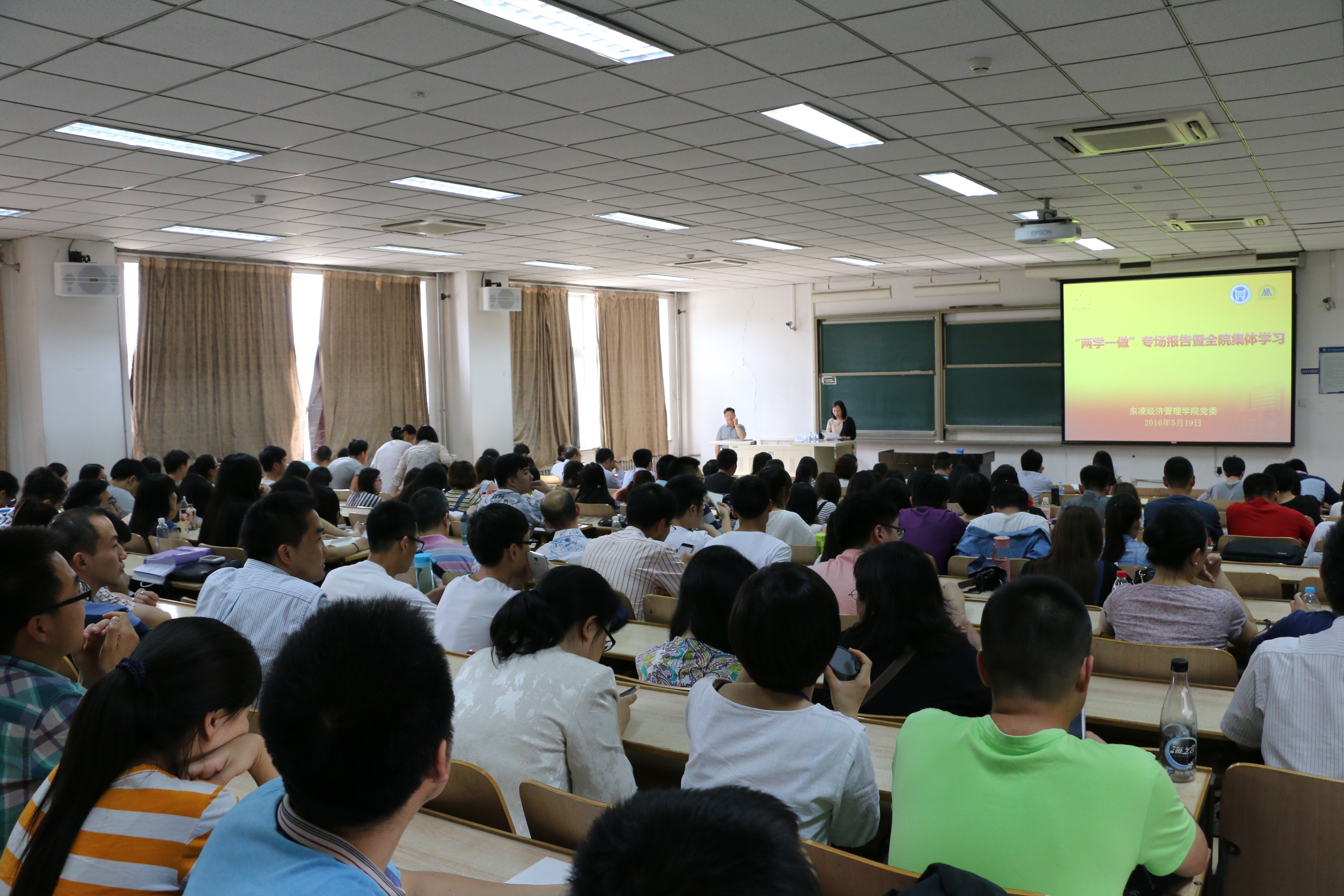 为推动全面从严治党向基层延伸,巩固拓展党的群众路线教育实践活动和“三严三实”专题教育成果,贯彻落实学校党委关于在全体党员中开展“学党章党规、学系列讲话,做合格党员”学习教育的工作部署,5月19日下午,东凌bat365官方网站“两学一做”专场报告暨全院集体学习在逸夫楼105举行,学院党政领导班子成员、党委委员、全体教职工和学生党员代表参加了学习,学院党委书记戴淑芬主持学习会。
