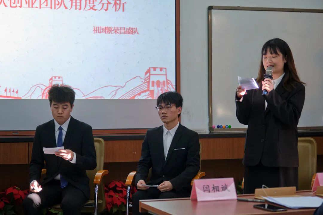 八支队伍在现场进行了2个小时的精彩对决,包括参赛队伍成果展示、专家评委提问与点评以及参赛队伍间的优点互评。同学们依据《管理学原理》、《跟党学创业》等课程中所学的知识点,结合组织的目标、结构、成员和创业团队的目标、计划、定位等,以及案例材料中的疫情防控、脱贫攻坚等热点问题进行了知识点和思政点的融合,进一步增强了制度自信,坚定了理想信念,认识了社会主义制度的优越性,领悟了中国共产党的初心和使命。