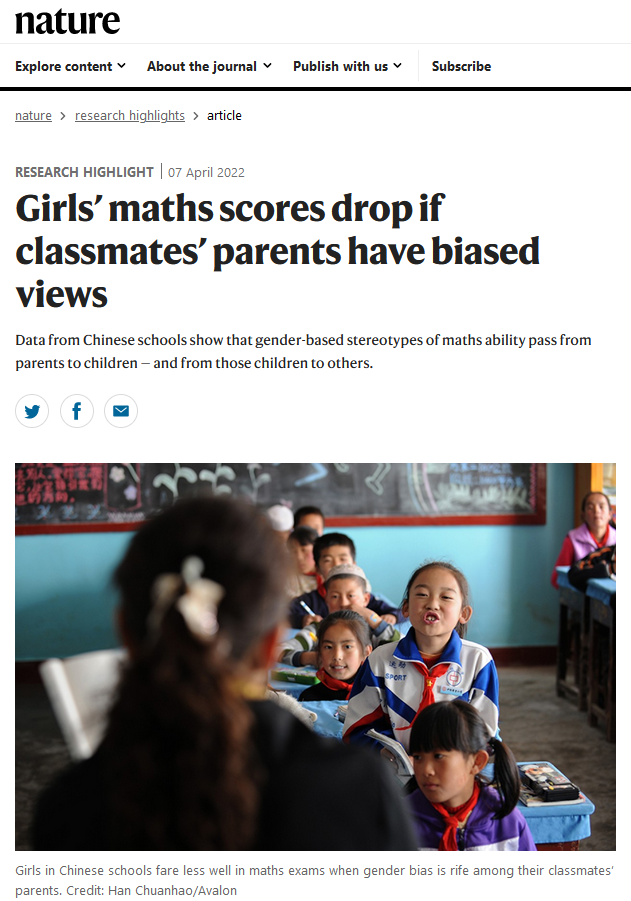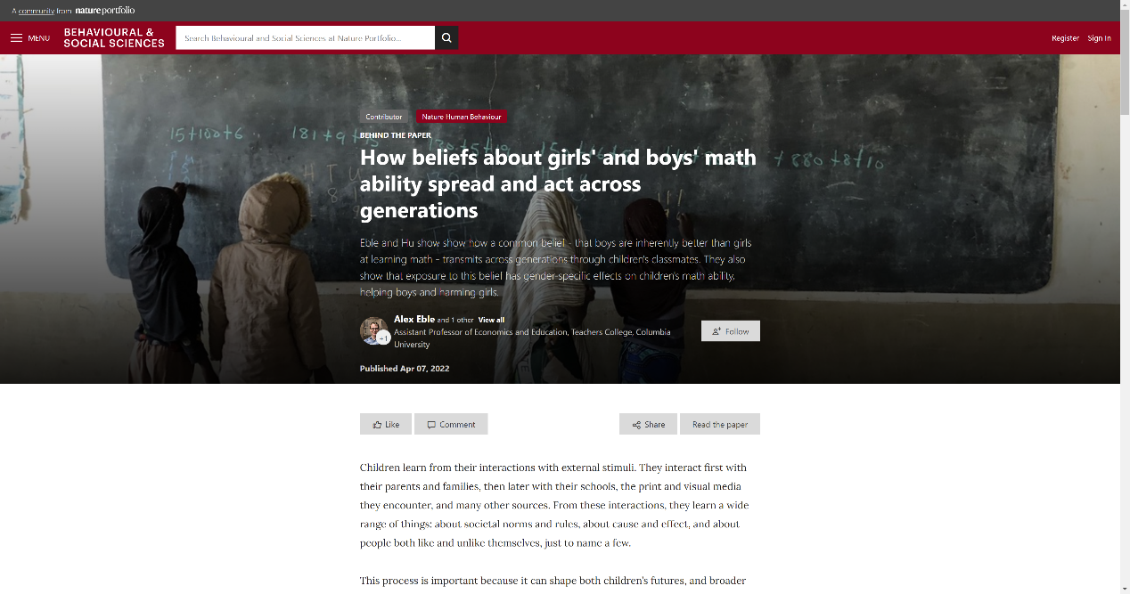 近日,我院工商管理系胡枫教授与美国哥伦比亚大学 Alex Eble 助理教授合作撰写的学术论文 Gendered beliefs about mathematics ability transmit across generations through children’s peers(中译:关于数学能力的性别观念的代际传递),在 Nature 子刊《Nature Human Behavior》发表。