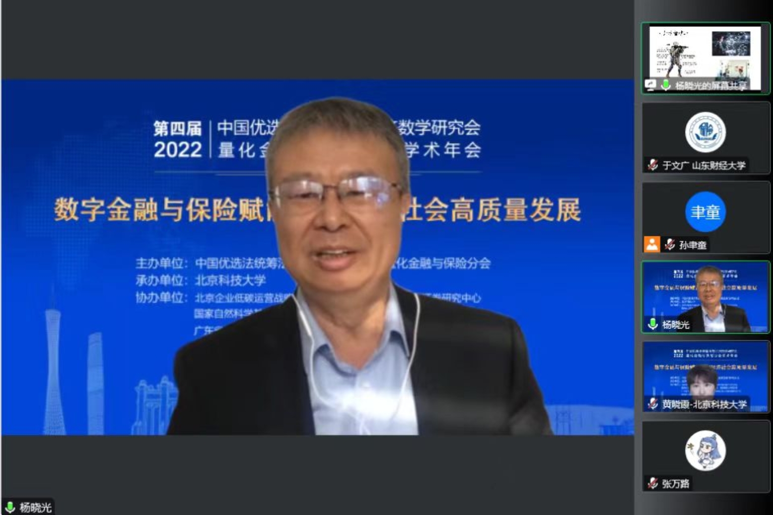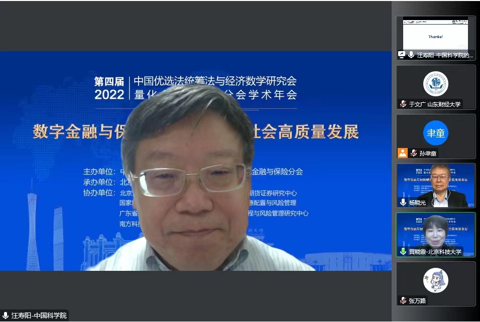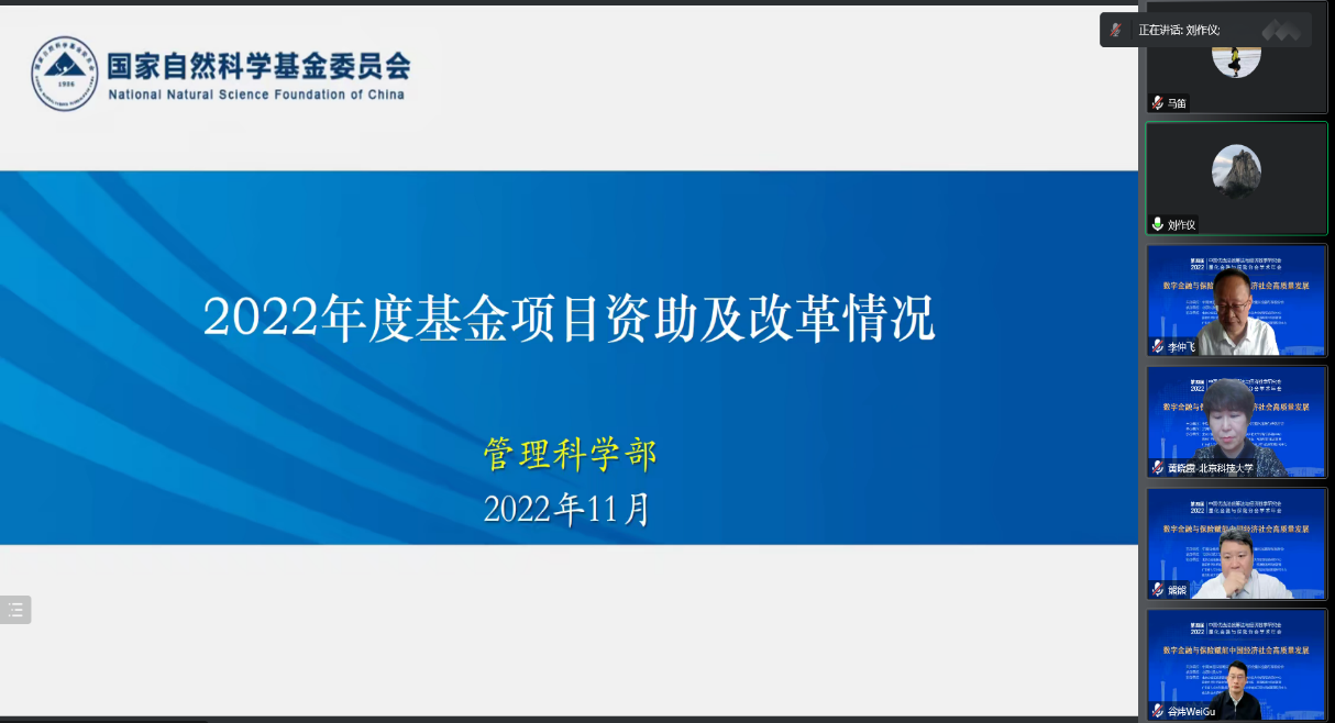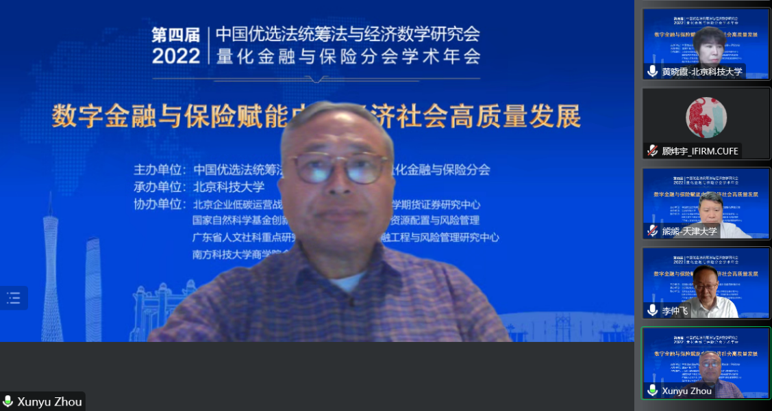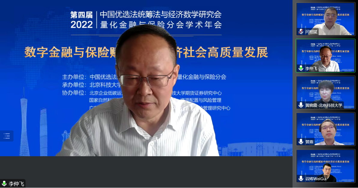 开幕式后,由国家自然科学基金委管理科学部副主任刘作仪、哥伦比亚大学的周迅宇教授、中国科学院的汪寿阳院士和中国科学院系统科学研究所副所长杨晓光研究员作大会报告。首先,刘作仪主任作了题为《2022年度基金项目资助及改革情况》的大会报告,详细介绍了2022年度管理学部基金资助情况和改革情况。然后,周迅宇教授作了题为《ReinforcementLearninginContinuousTimewithFinancialApplications》的大会报告,介绍了无模型连续时间强化学习及其在金融资产管理中的应用。上半场大会报告由大会主席李仲飞理事长主持。汪寿阳教授作了题为《加密货币的几个问题》的大会报告,从比特币挖矿谈起,通过几个案例来分析数字经济时代风险管理的一些新问题,并针对这些新问题,提出新理论、新方法与新技术,促进数字经济风险管理理论的研究与发展。最后,杨晓光研究员作了题为《数字经济的内在逻辑》的大会报告,报告指出了从卖方经济到买方经济的人类行为的变化,使得互联网和信息技术全面赋能经济各个环节,并阐述了数字经济的经济产出中市场和数据要素的重要性。下半场大会报告由bat365官方网站副院长黄晓霞教授主持。大会报告内容丰富、精彩纷呈,为参会人员呈现了一场量化金融与保险前沿研究的思想盛宴。大会报告期间通过腾讯会议参与大会报告学习讨论的人数达到了300上限,同时还有近500人通过线上直播的方式参与大会报告的学习。