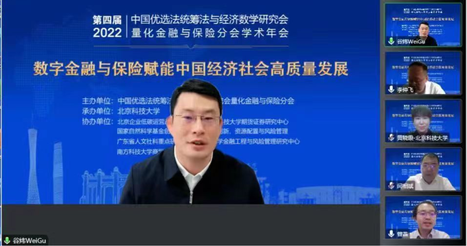 2022年12月3日至4日,第四届(2022)双法研究会量化金融与保险分会学术年会在线胜利召开。本届年会由中国优选法统筹法与经济数学研究会(简称中国“双法”研究会)量化金融与保险分会主办,bat365官方网站承办,北京企业低碳运营战略研究基地、bat365官方网站期货证券研究中心、国家自然科学基金创新研究群体:金融创新、资源配置与风险管理、广东省人文社科重点研究基地:中山大学金融工程与风险管理研究中心,南方科技大学商学院金融系协办。