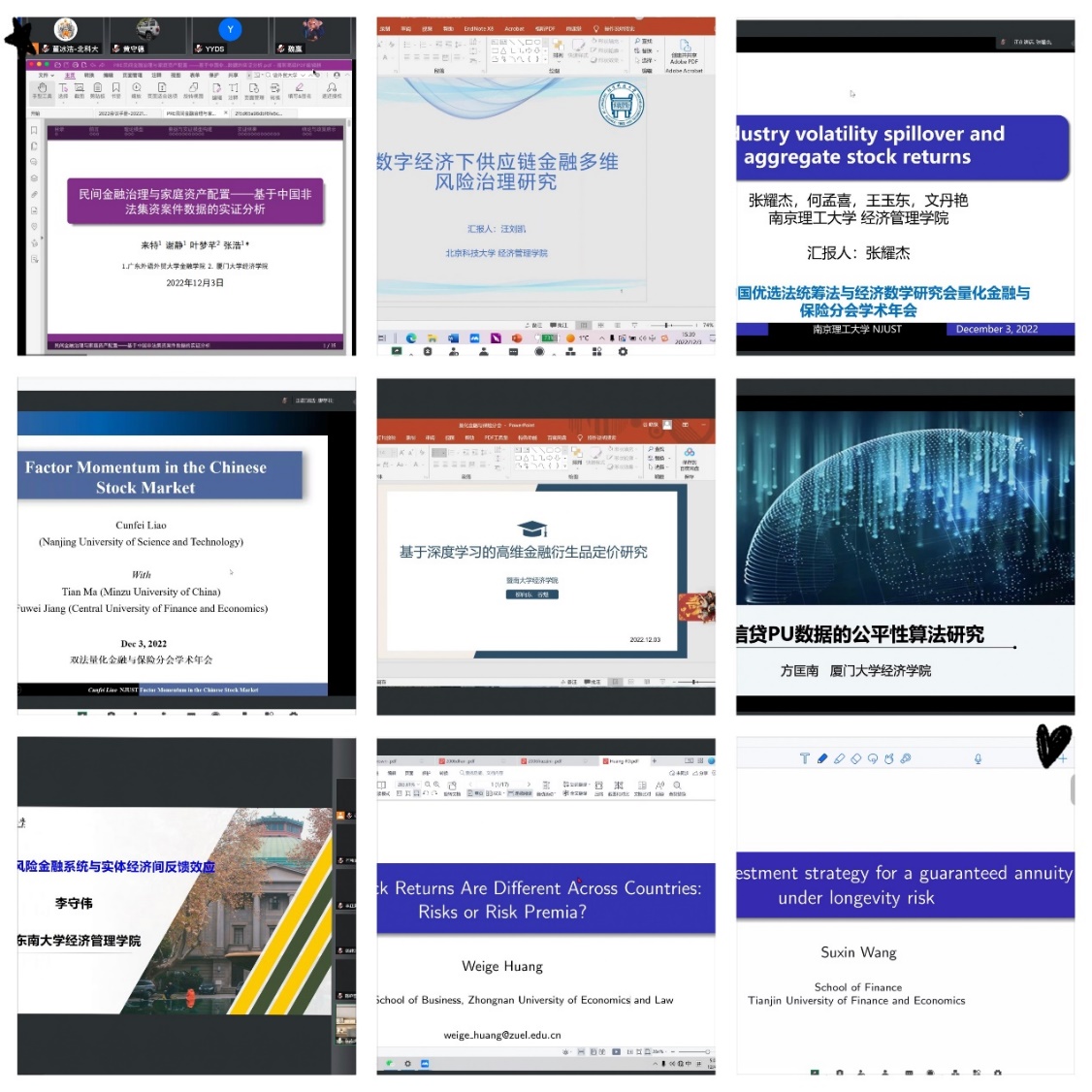 12月3日和4日下午,年会举行了31组分组报告,共计124个报告,围绕绿色金融、行为金融、金融科技、资产配置、资产定价、大数据金融、供应链金融、风险管理、保险精算、资产定价、区块链、家庭金融、养老金融、金融风险管理、ESG投资、期权定价、绿色金融、数字金融、资本市场、实证资产定价等不同主题进行分组汇报与研讨。来自复旦大学、中山大学、香港中文大学、香港科技大学(广州)、南京大学、武汉大学、南方科技大学、中国人民大学、天津大学、南开大学、北京航空航天大学、华南理工大学、厦门大学、bat365官方网站、上海大学、东南大学、中南大学、大连理工大学、湖南大学、南京理工大学、深圳大学、苏州大学、北京工业大学、暨南大学、西交利物浦大学、对外经济贸易大学、中央财经大学、中南财经政法大学、西南财经大学、中国矿业大学、湘潭大学、浙江工商大学、湖南师范大学、北京林业大学、广东工业大学、广东外语外贸大学、贵州财经大学、海南大学、南京审计大学、上海对外经贸大学、重庆工商大学、安徽财经大学、天津财经大学、长沙理工大学、西北农林科技大学、兰州财经大学、广东财经大学、山西财经大学、西藏大学、山西大学、太原科技大学、天津工业大学、四川农业大学、广东金融学院、广州市社会科学院、北京雁栖湖应用数学研究院等高校的学者们在小组上报告分享了最新的研究成果。同一时间有近300人参与分组报告的学习讨论,各学者就小组主题展开热烈讨论并交换宝贵意见,极大地促进了学者之间的学术交流。