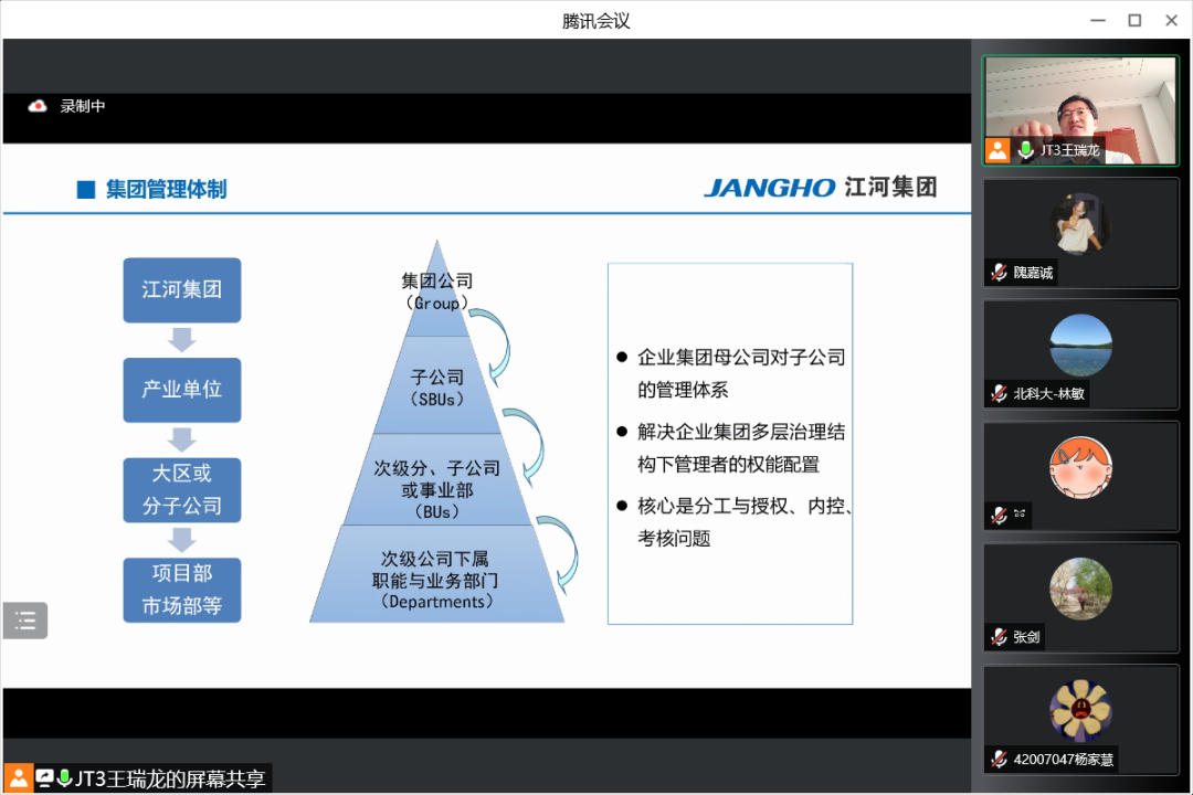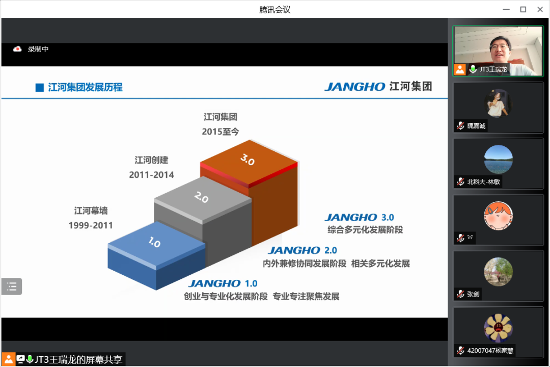 7月19日上午,江河集团行政人事总监王瑞龙应邀参加bat365官方网站工商管理系2020级企业认识与实践的认识实习,并为同学们精心介绍江河集团的管理体系和人力资源管理模式。本次认识实习共三部分,首先是王总为同学带来主题讲座,其次由集团的部门负责人带领同学在线参观集团的北京工厂与成都公司办公环境,最后由王总与各位同学老师交流互动。工商管理系林敏老师担任主持人,工商管理系系主任张剑,何润宇、尹奎等老师与工商管理系20级全体本科生出席本次活动。