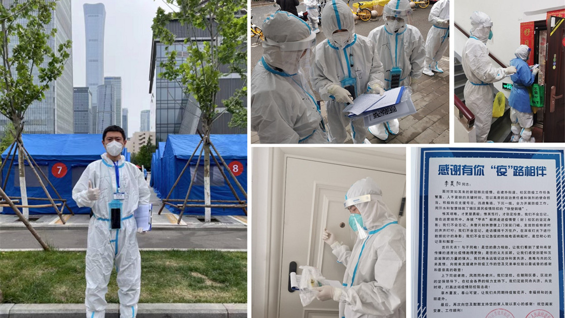 作为朝阳区大屯街道下沉包社区干部,我直接参与社会面核酸筛查工作,日均居民核验量1300人以上。而后作为抗疫先锋队骨干抽调支援建外街道封控区的紧急抗疫任务,期间参与涵盖除专业医护职责外的几乎各方面工作。团队及个人受到建外街道授予的锦旗和书面感谢信。目前建外街道封控区支援工作已经结束,我们即将回到辖区内继续投入到新一轮疫情防控工作中。新冠疫情深刻影响了这个世界,我相信并期盼着疫情能够尽快终结,大家都能再次恢复到正常的生活、学习和工作状态中,尤其盼望我们能再度聚首于北科校园之中,接受各位大咖老师们的传道、授业与解惑。为了这天能早日到来,让我们继续保持乐观心态,共同努力加油!