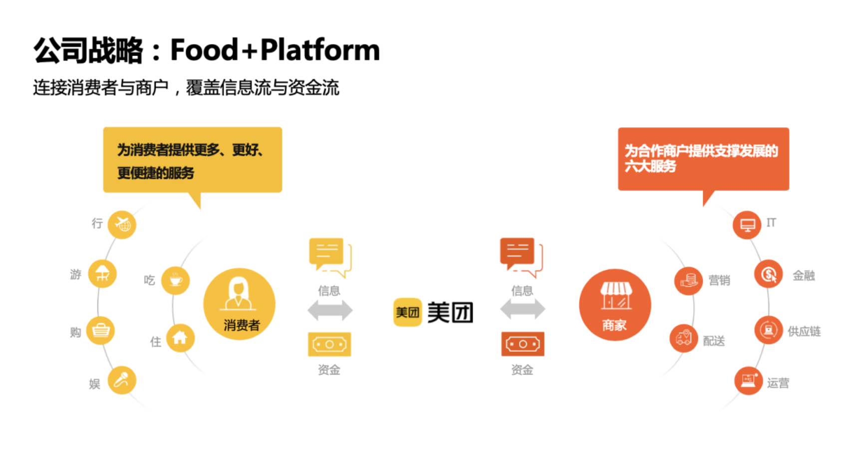 公司的战略思想“Food + Platform”,连接消费者与商户、覆盖信息流与资金流。美团作为中间平台如桥梁一般将消费者与商家端进行连接。商家端为合作商户提供支撑发展的六大服务:IT、金融、供应链、运营、营销、配送,为消费者从吃、住、行、游、购、娱几大方面提供了更多、更好、更便捷的服务。