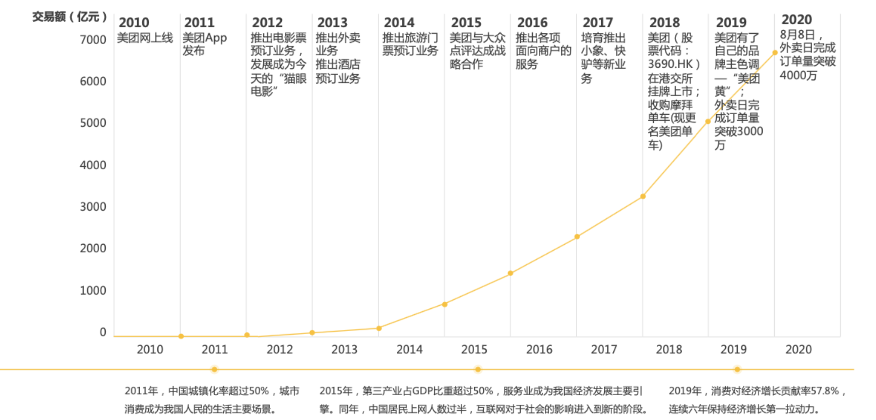 美团成立至今已有10年的发展历程,2010年美团网PC端上线,2011年美团APP正式对外发布,从此便揭开了大众吃穿住行娱等全场景线上服务的序幕,如今美团的外卖日订单峰值可突破4000万单,成为全中国乃至全球最大的外卖平台,美团顺应时代,同时也改变了时代。