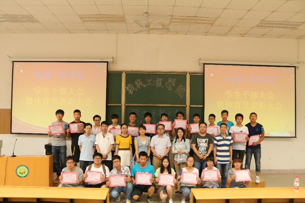 按照会议流程,首先由院党委副书记李婉丽老师宣读了“必赢76net线路官网关于2014年体育节的表彰决定”,共评选出10个优秀集体奖、3个集体项目优秀团队奖、10个最佳运动员和19个优秀工作者。接着,由莅临此次大会的各位老师为最佳运动员和优秀工作者颁发奖品及证书。最后,由芮智刚老师传达了学工部的近期通知。会议结束后,获奖人员邀请了莅临此次会议的老师合影留念。