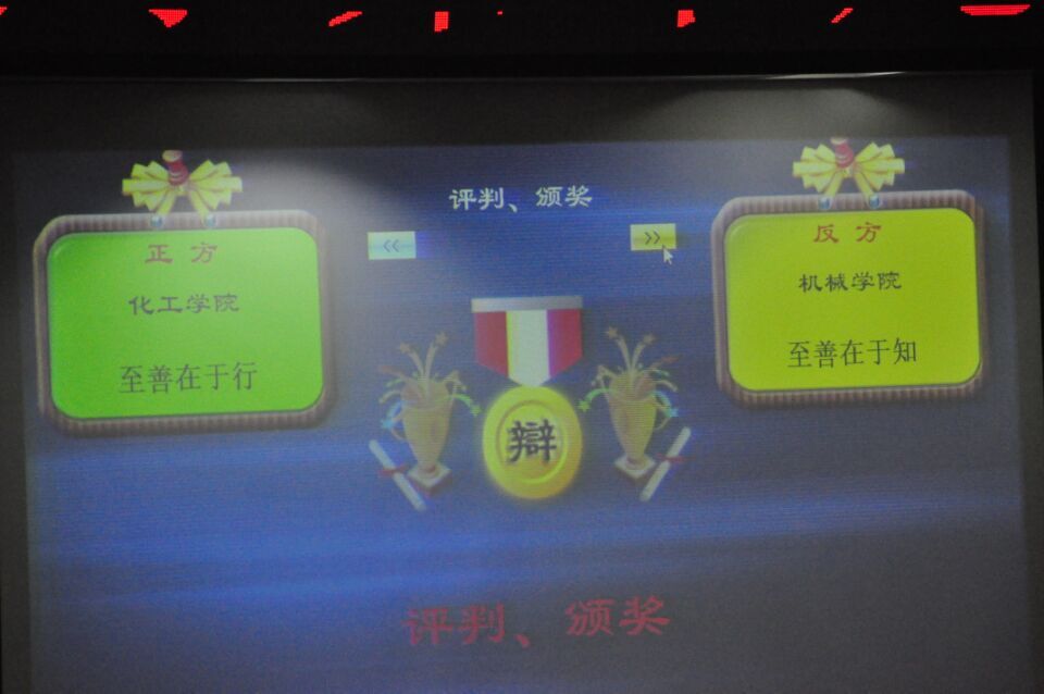 决赛中,辩论主题为“至善在于行还是知”,分为各方观点陈述、相互提问和自由辩论三个环节。担任正方的是化工学院代表队,担任反方的是必赢官网代表队,所持观点为“至善在于知”。必赢官网由2015级井天智、李阳、王师煜、邢迎光、李腾腾同学组成代表队在比赛中引经据典、旁征博引,经过激烈的辩论最终获得第一名。
