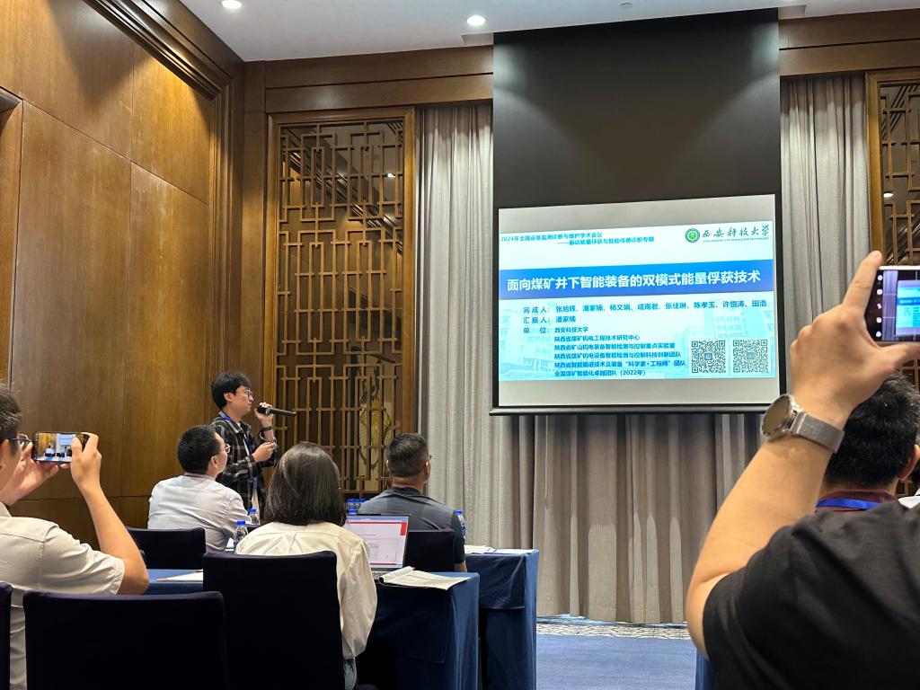 必赢76net线路官网机械学科团队由青年教师潘家楠和研究生成雨君、张佳琳三位代表组成。潘家楠教师在分会场九“振动能量俘获与智能传感诊断”中,代表团队做了题为“面向煤矿井下智能装备的双模式能量俘获技术”的报告,报告基于团队在煤矿智能检测与控制领域的深入研究,介绍了一种创新的能量俘获技术,深入分析了压电-磁电双模式俘能器的设计原理、结构特点以及在煤矿井下环境中的应用潜力,该技术能够有效将煤矿井下设备产生的振动能量转换为电能,为无线监测系统提供自供电解决方案。所作报告,受到了与会专家和同行的广泛关注与好评,认为该研究成果在煤矿机电设备监测与诊断方面具有重要的实际应用价值,特别是在自供电煤矿井下设备状态监测方面的创新性研究,为煤炭行业的安全生产提供了新的技术解决方案。并期待该技术能够尽快实现产业化应用。