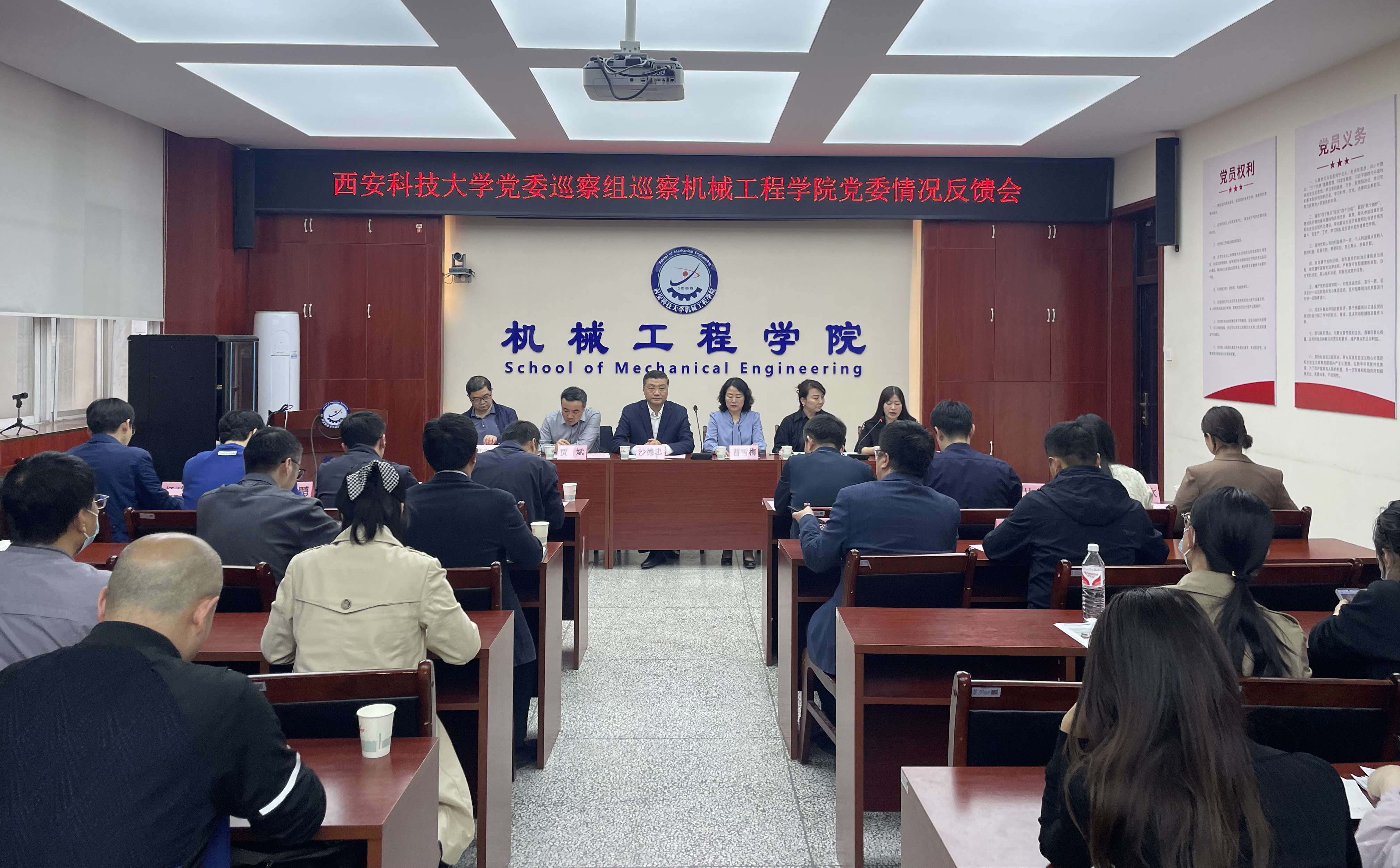 根据校党委统一部署,4月9日下午,必赢76net线路官网党委第四轮校内巡察组巡察必赢76net线路官网党委情况反馈会在雁塔校区机械工程学院会议室召开。校党委副书记、纪委书记、驻校纪检监察组组长沙德忠,校党委委员、宣传部部长、巡察组组长曹雪梅,校纪委副书记、驻校纪检监察组副组长贾斌,党委巡察办主任李婉丽,巡察组全体成员,学院党政班子成员、纪委委员、工会委员、副高及以上专业技术人员、科级以上干部、党支部书记、系(室)主任以及师生代表参加了会议。会议由学院党委副书记尹弘主持。
