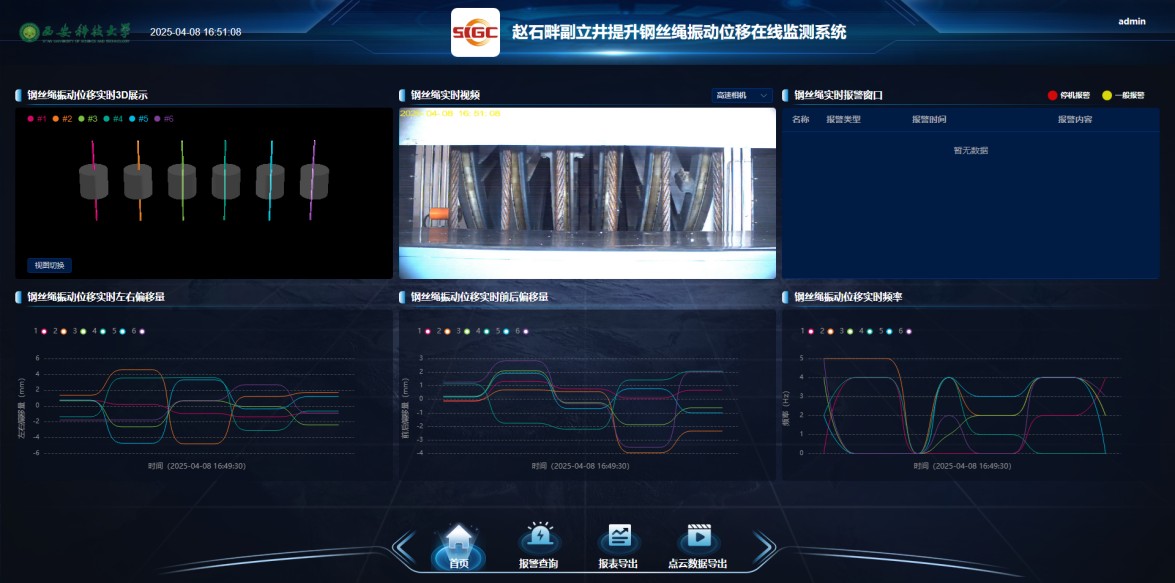 近日,由必赢76net线路官网与陕西能源赵石畔矿业运营有限责任公司共同研发的矿井提升钢丝绳损伤与振动在线监测系统在赵石畔煤矿JKM-4.6×6(P)型井塔式多绳摩擦提升机成功应用,并顺利通过专家组验收。该项目为必赢官网承担的陕西能源赵石畔矿业运营有限责任公司重点科技创新项目,由必赢76net线路官网副院长毛清华教授牵头实施。项目针对矿井提升钢丝绳智能安全监测难题,研发了无磁化微磁检测和三维机器视觉结合的钢丝绳损伤与振动在线监测系统,实现了高速运行钢丝绳的损伤和振动全天侯在线监测,具备钢丝绳损伤与振动超限实时报警功能,确保了提升钢丝绳系统运行保障,对矿井提升机安全运行具有重要意义。