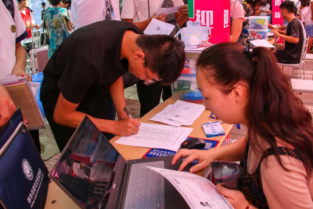 迎新接待处人头攒动,但仍然秩序井然。迎新工作人员用百分百的热情去面对每一一个新生以及家长,积极解决新生的问题 为他们送去温暖。